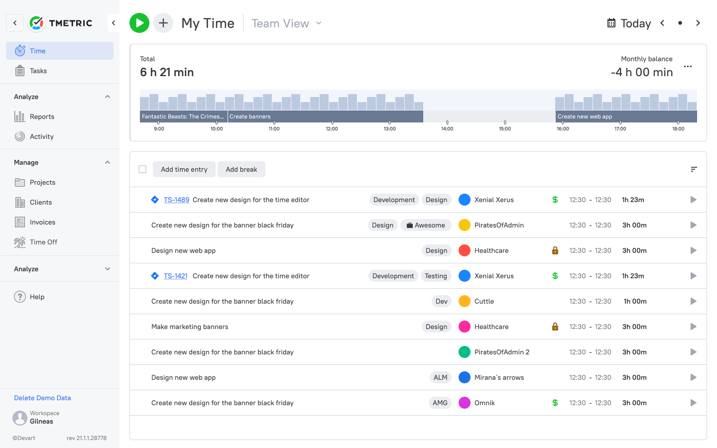 TMetric is a time tracking and productivity app designed to help remote teams track work hours, manage tasks, and monitor team activities in real time. The solution also comes with a set of features for detailed reporting, client billing, expense tracking, and invoicing, making it an all-in-one app for businesses of all sizes.