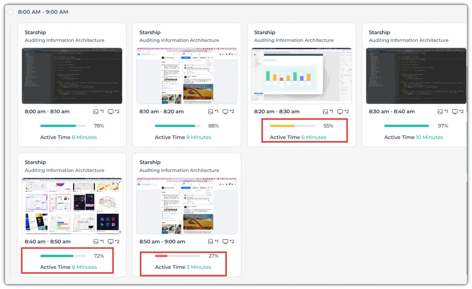 Employees with a red activity color indicate low activity levels, suggesting limited interaction during the tracked time. The green color represents a healthy or consistent level of activity, showing that the employee is actively engaged in their work.