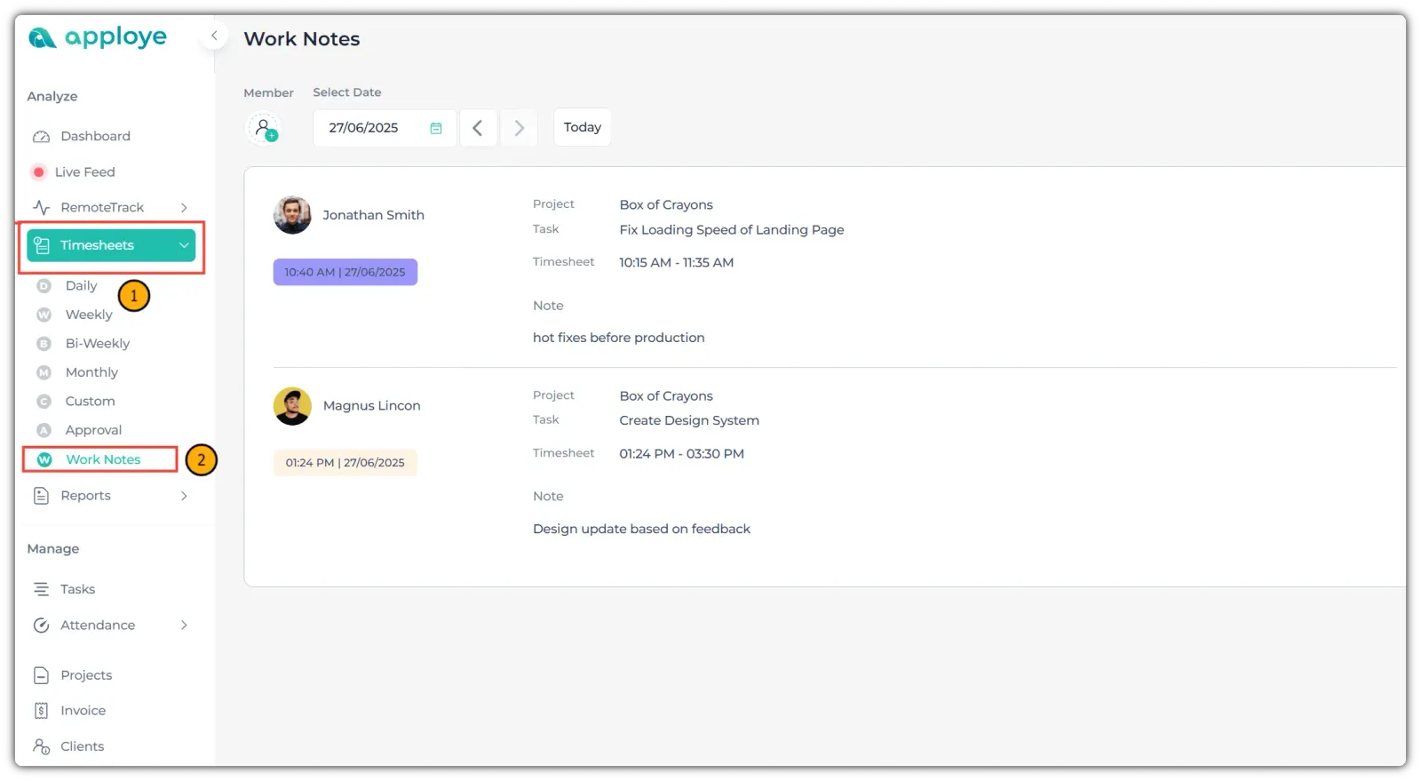 To view the notes, click on Go to Timesheets>Work Notes from the web app.