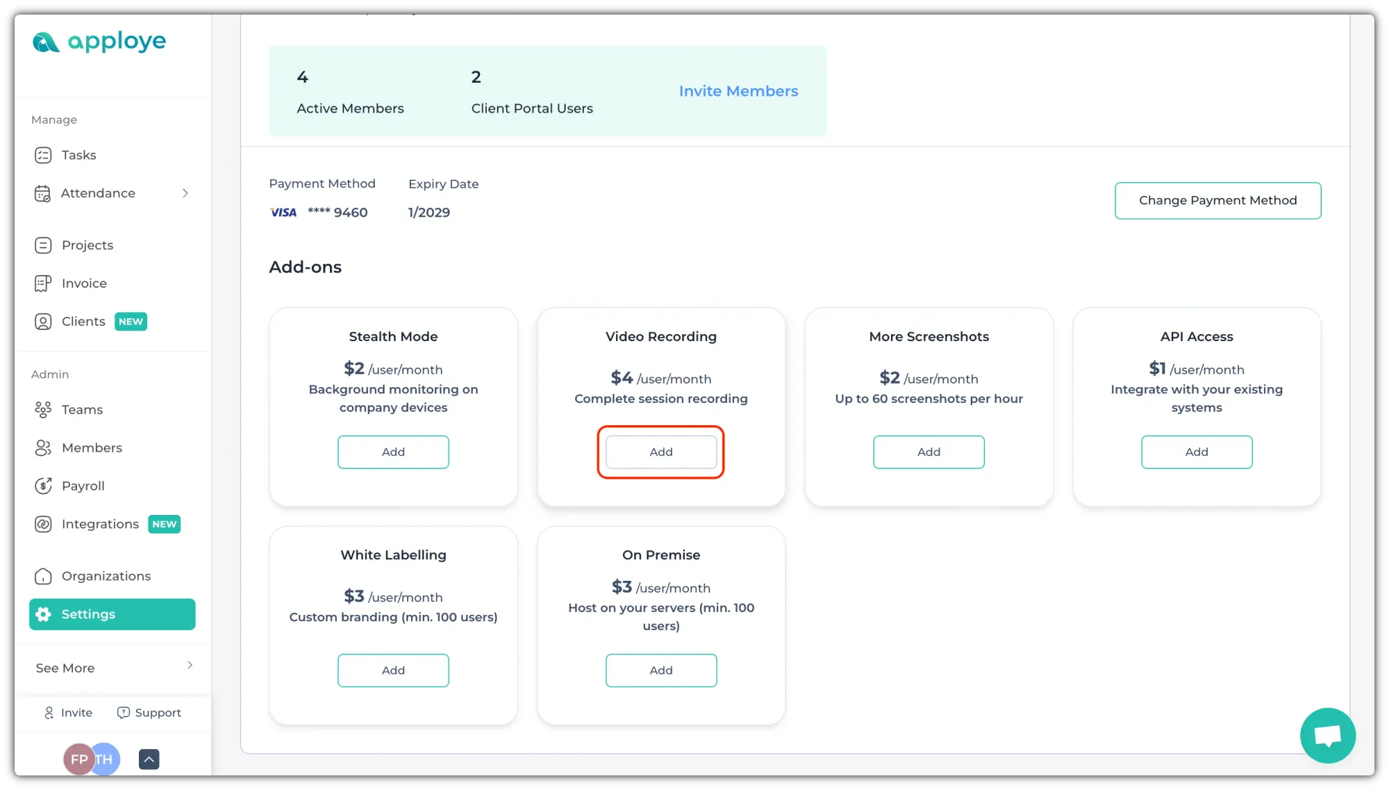 Apploye add-ons are optional modules that you can turn on or off for your organization. They help you customize Apploye to match how your team actually works, without clutter or extra features you don’t need.