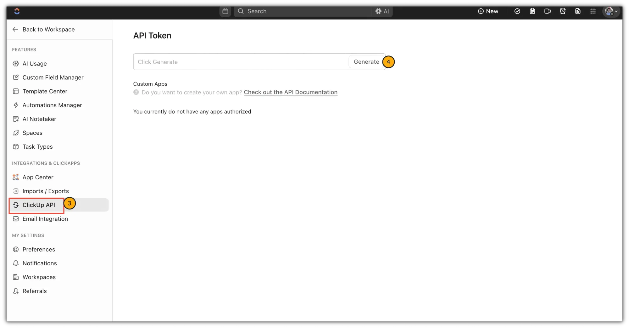To connect Apploye with ClickUp, you'll need to generate an API token from your ClickUp account. Please follow the steps below: