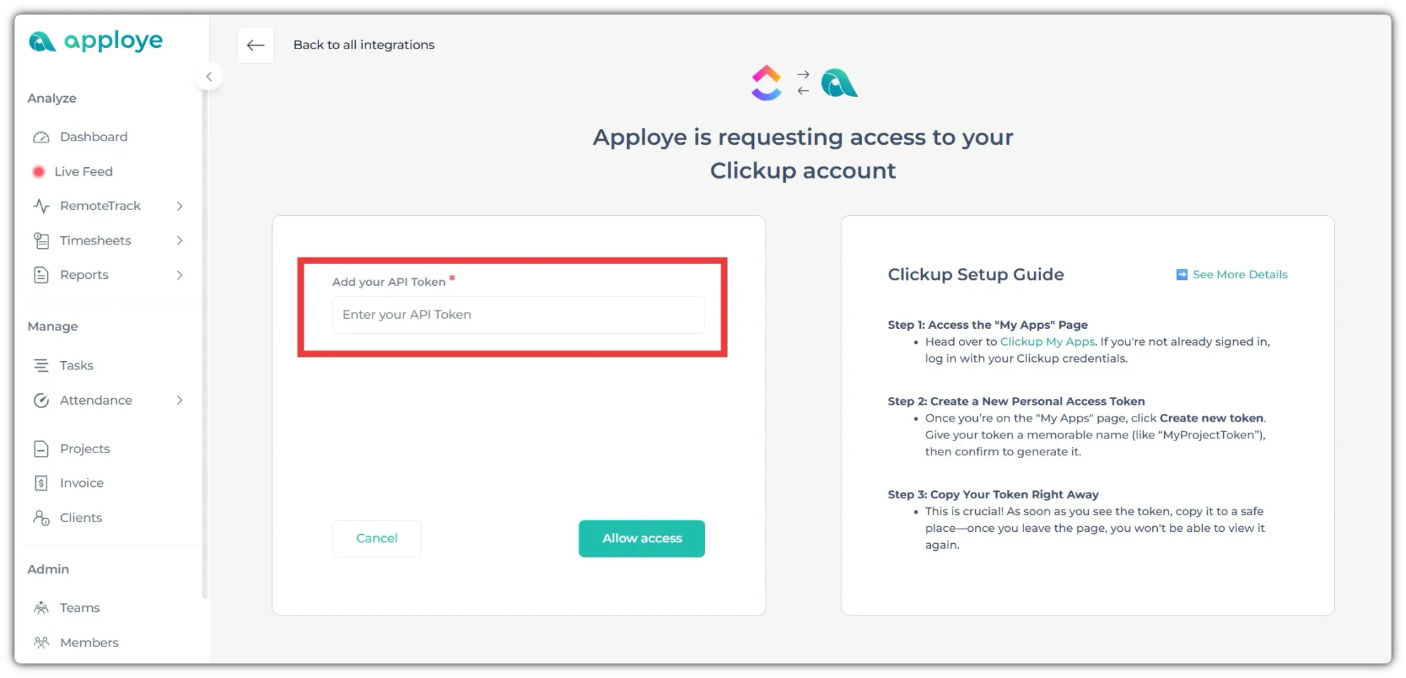 7. Add your API Token in the Apploye Clickup Integration Page and Click on Allow Access.