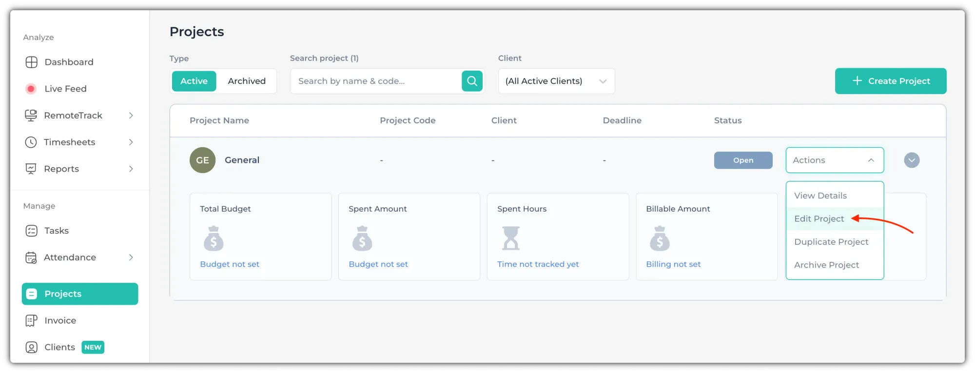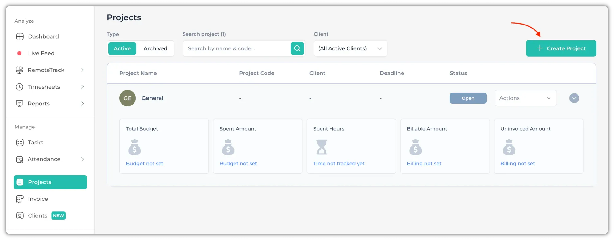 Now, let us show you how to create a project & assign members. Without being assigned to a project, you/your employees canโt start the tracker. You can assign tasks under the project. You can do budgeting, and add permission for your employees.