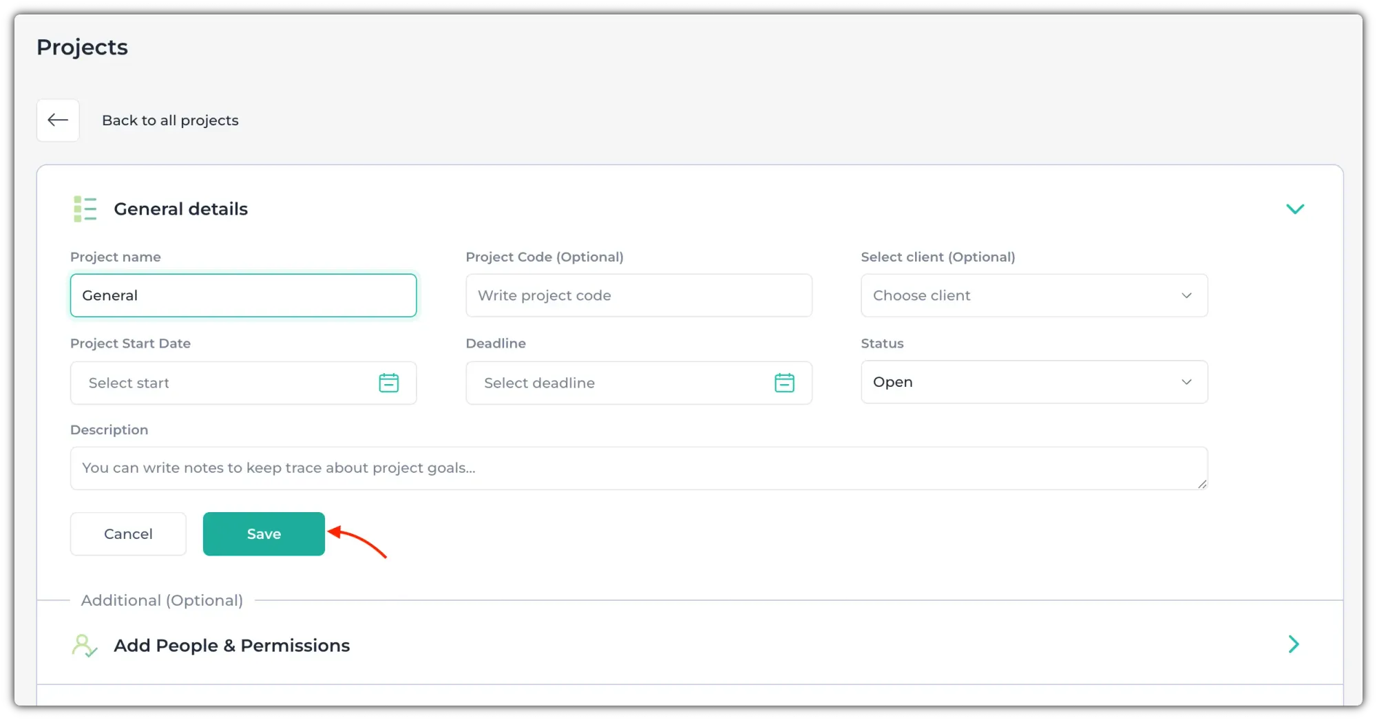 ๐ Now, you will be taken to the Create Project page. You need to add a name for the project and may choose to add details (you can add them later too), then click on the โSaveโ button.