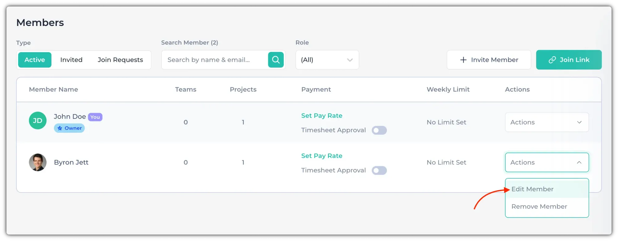 ๐ Go to the โMembersโ page. And click on โActionsโ> โ Edit Member โ. Alternatively, if you haven't set up a pay rate, you can click on "Set Pay Rate," and it will take you to the Member details page.
