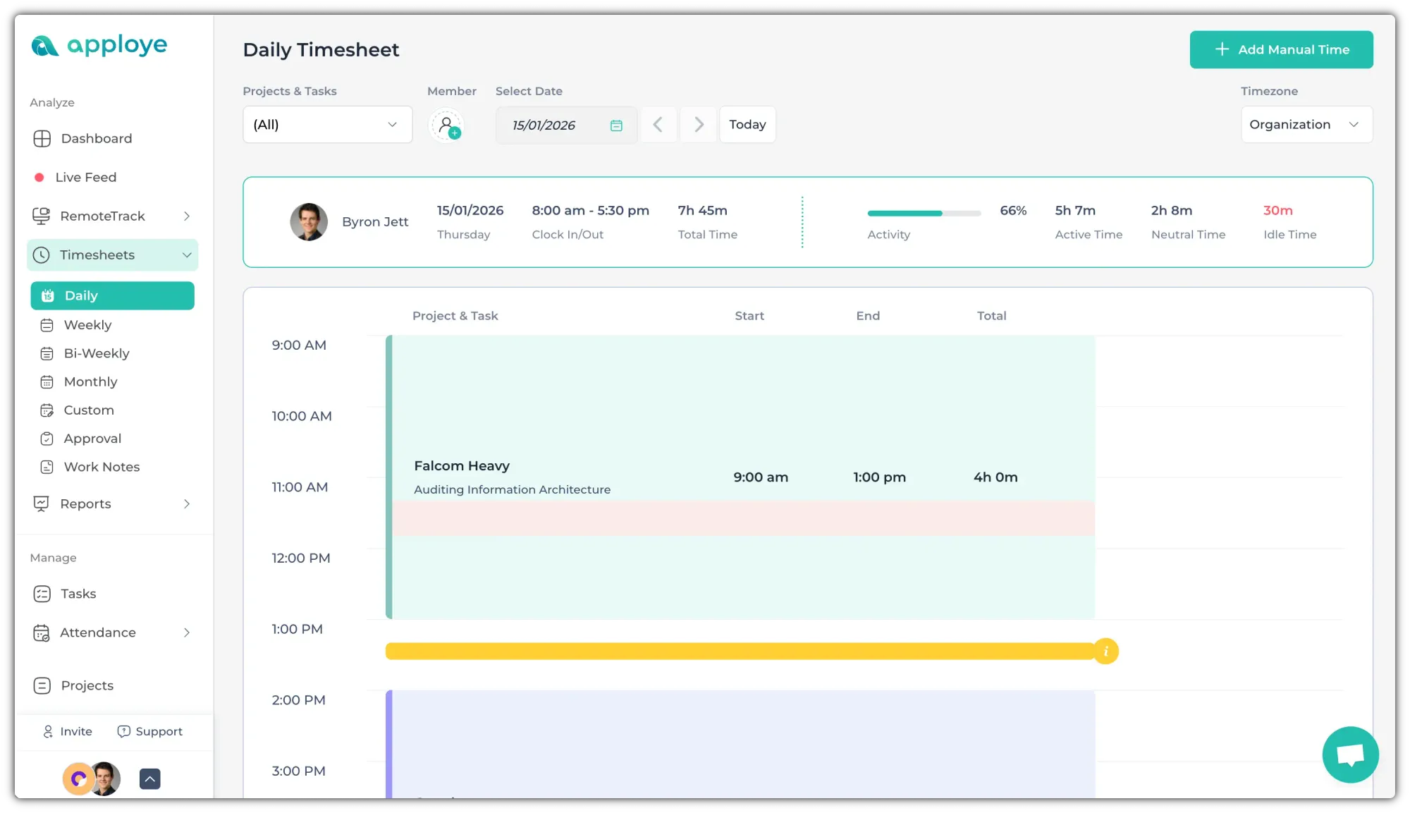 Apploye can track which application/software your employees are on and how much time they have spent on it, with activity percentage.