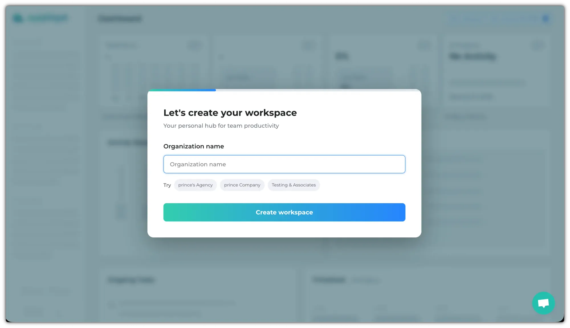 After signing up and verifying your account, you will need to give the organization's name. Click on the "Create Workspace" button to go to the next step.