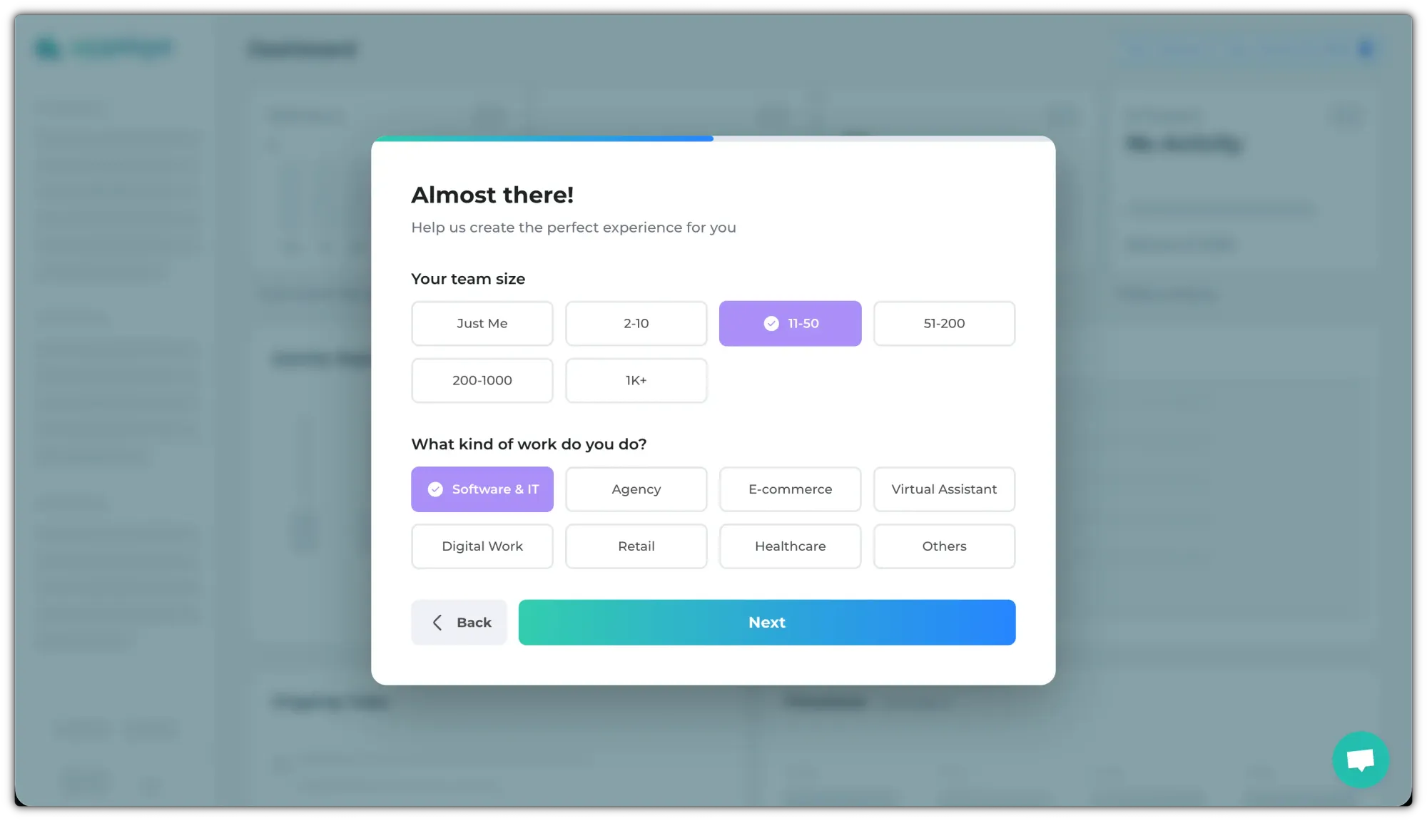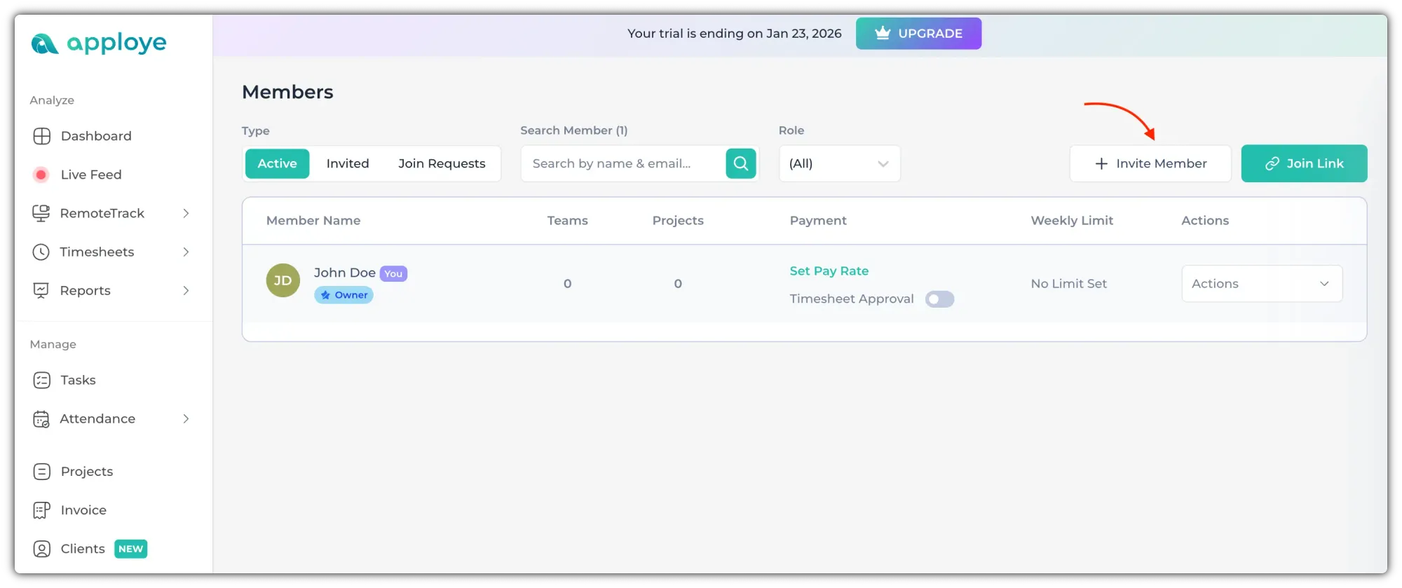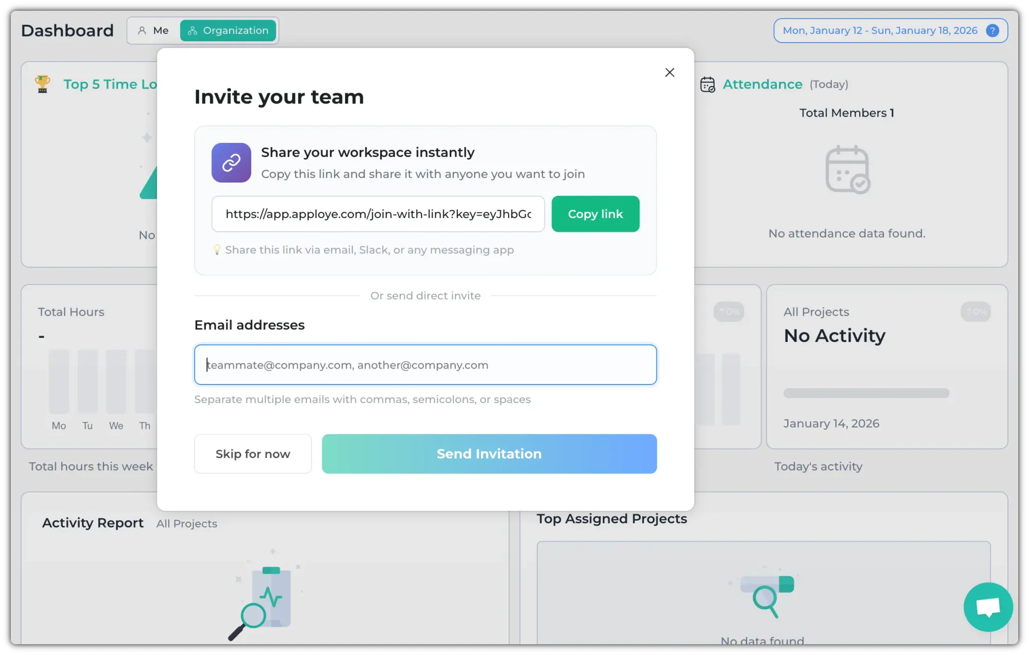After joining Apploye, you will see a pop-up to invite team members. Using this pop-up, you can invite employees to work in your organization (You can add them later, too).