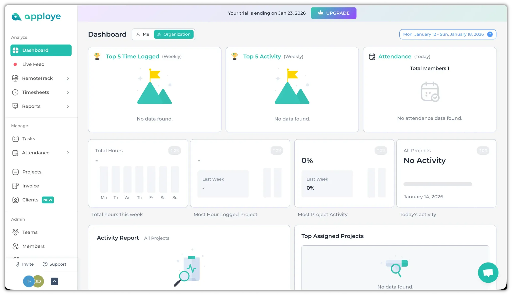 The next thing that youโll see is your Dashboard (Right now, itโs empty because thereโs no data to show, as you/your employees havenโt yet started the tracker. Donโt worry, weโll get there ๐).