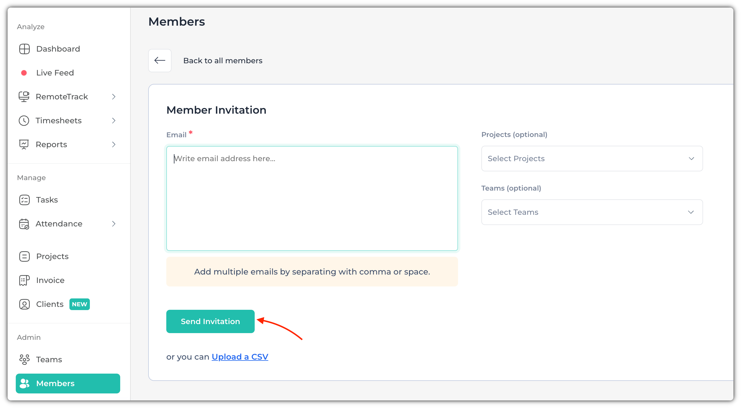 ๐ Go to the โMembersโ page and click on โ+ Invite Memberโ. Now, put their email address and select the projects you want to invite them to.