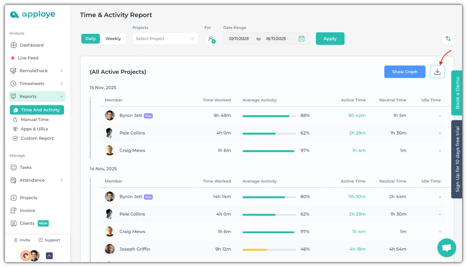 Once your team is onboarded, you can easily see them on your "member" list. Now, they will need to install their app to track time. For download, go to the Apploye website and click on More>Download. You can also directly go to this Download link.