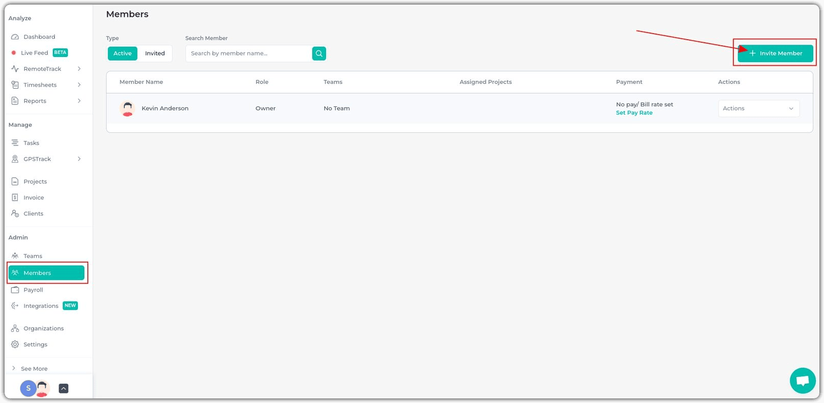 TL;DR: You have to invite the members first. Then, assign them a project and ask them to download the app and start tracking time. Then, you can check the timesheets, screenshots, and other data from the web app (you need to select member, if you want to see employee data).