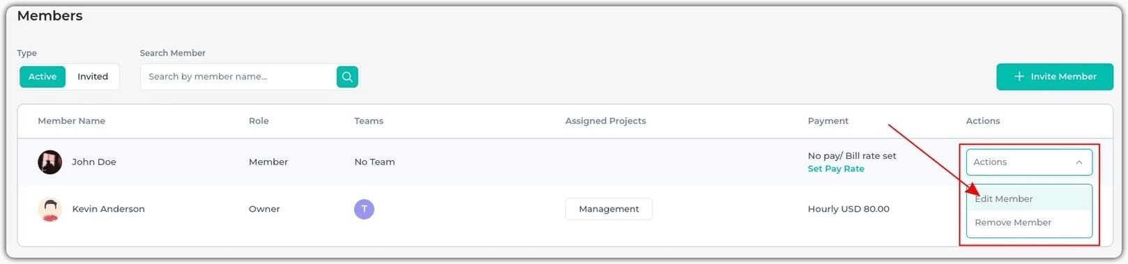 ๐ Go to the โMembersโ page. And click on โActionsโ> โ Edit Member โ. Alternatively, if you haven't set up a pay rate, you can click on "Set Pay Rate," and it will take you to the Member details page.