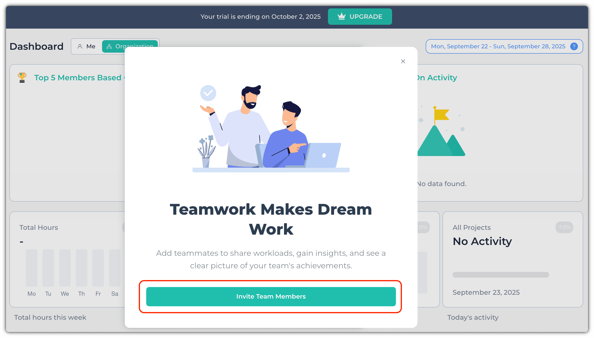 After joining Apploye, you will see a pop-up to invite team members. Using this pop-up, you can invite employees to work in your organization (You can add them later, too). Click on the "Invite Team Members" button to invite the team members.