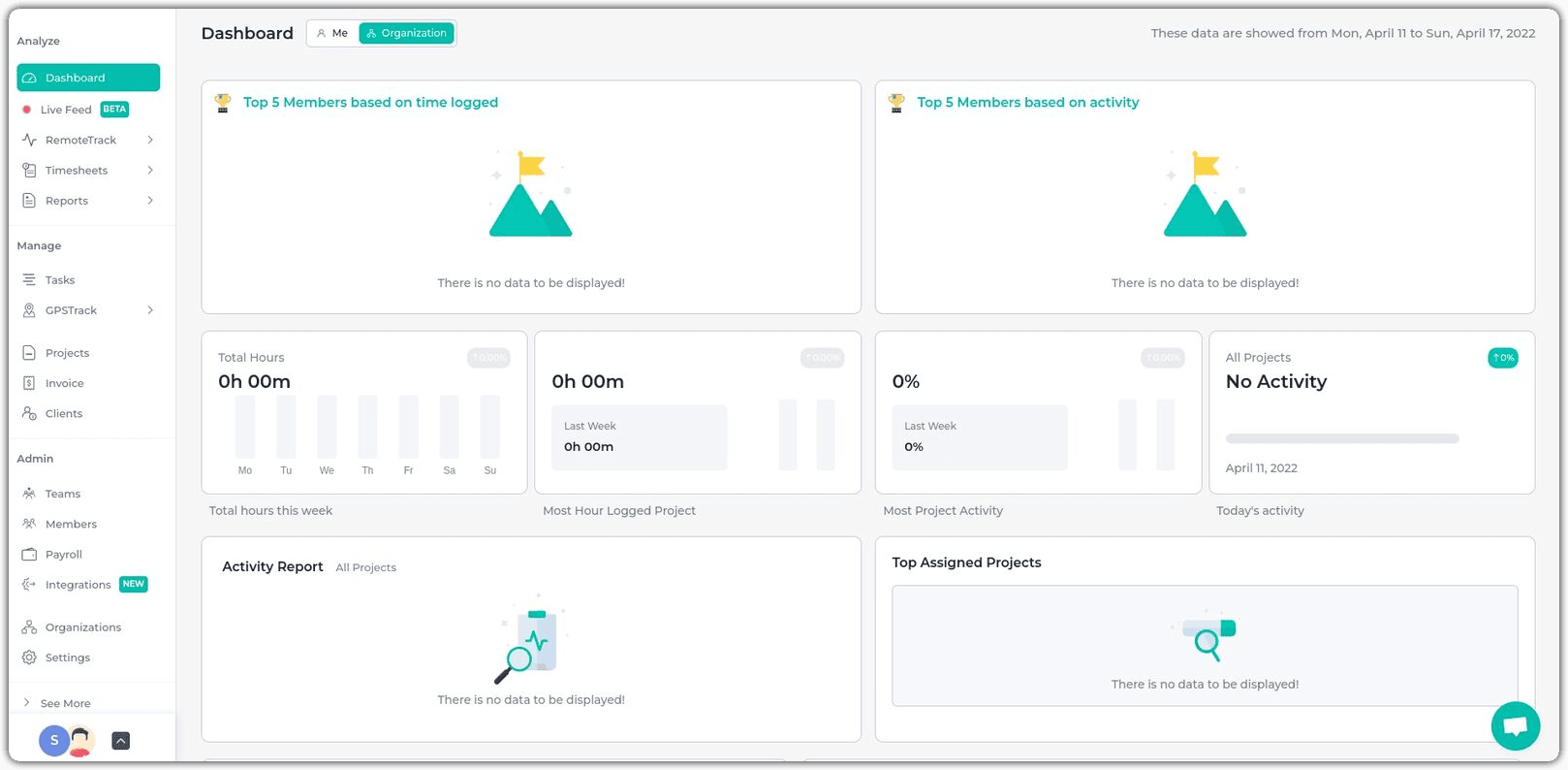 The next thing that youโll see is your Dashboard (Right now, itโs empty because thereโs no data to show, as you/your employees havenโt yet started the tracker. Donโt worry, weโll get there ๐).