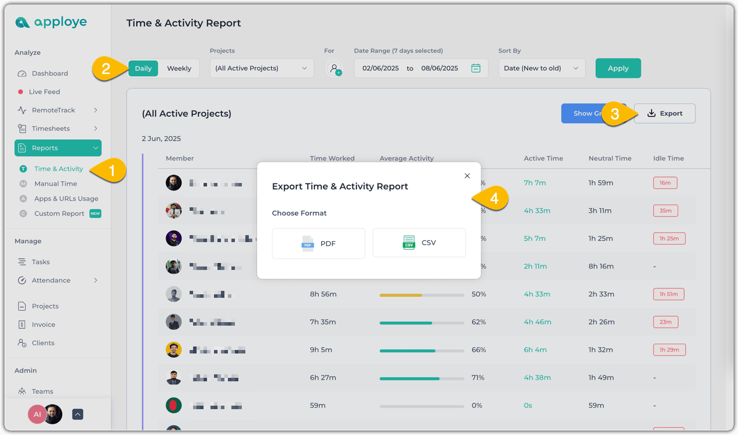 Apploye offers detailed reports that provide valuable insights into both strengths and areas for productivity improvement. These reports give you a clear understanding of employee performance, helping you optimize your team's efficiency for maximum results.
