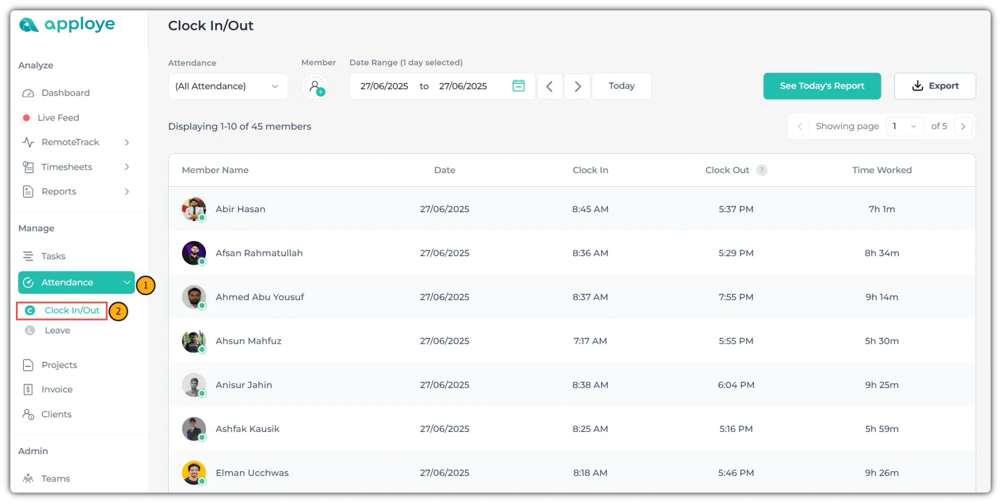 Apploye's attendance system allows you to maintain the clock-in and clock-out times and leave easily.