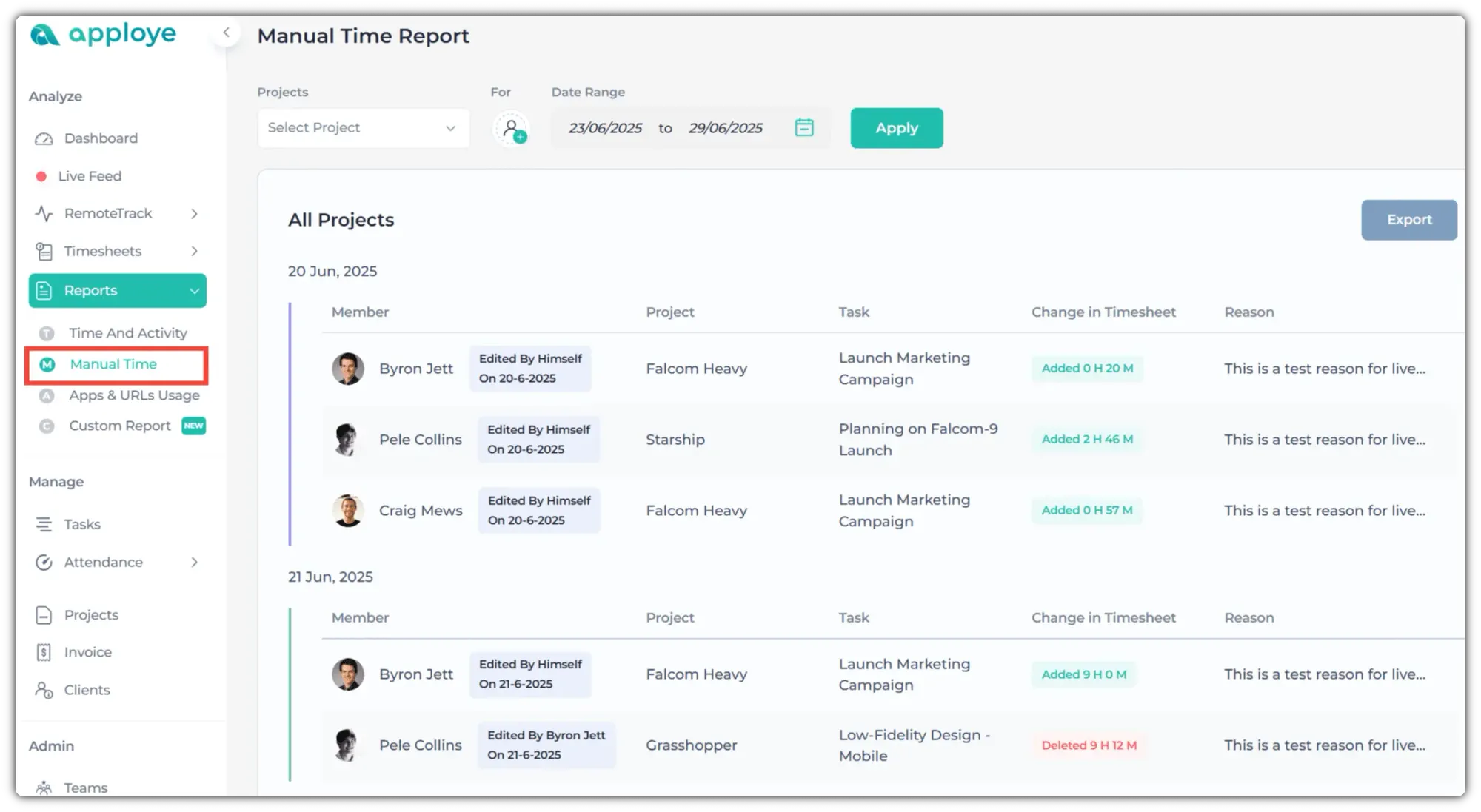 If employees have deleted screenshots or time from timesheets, you can check that from Manual Time Reports.