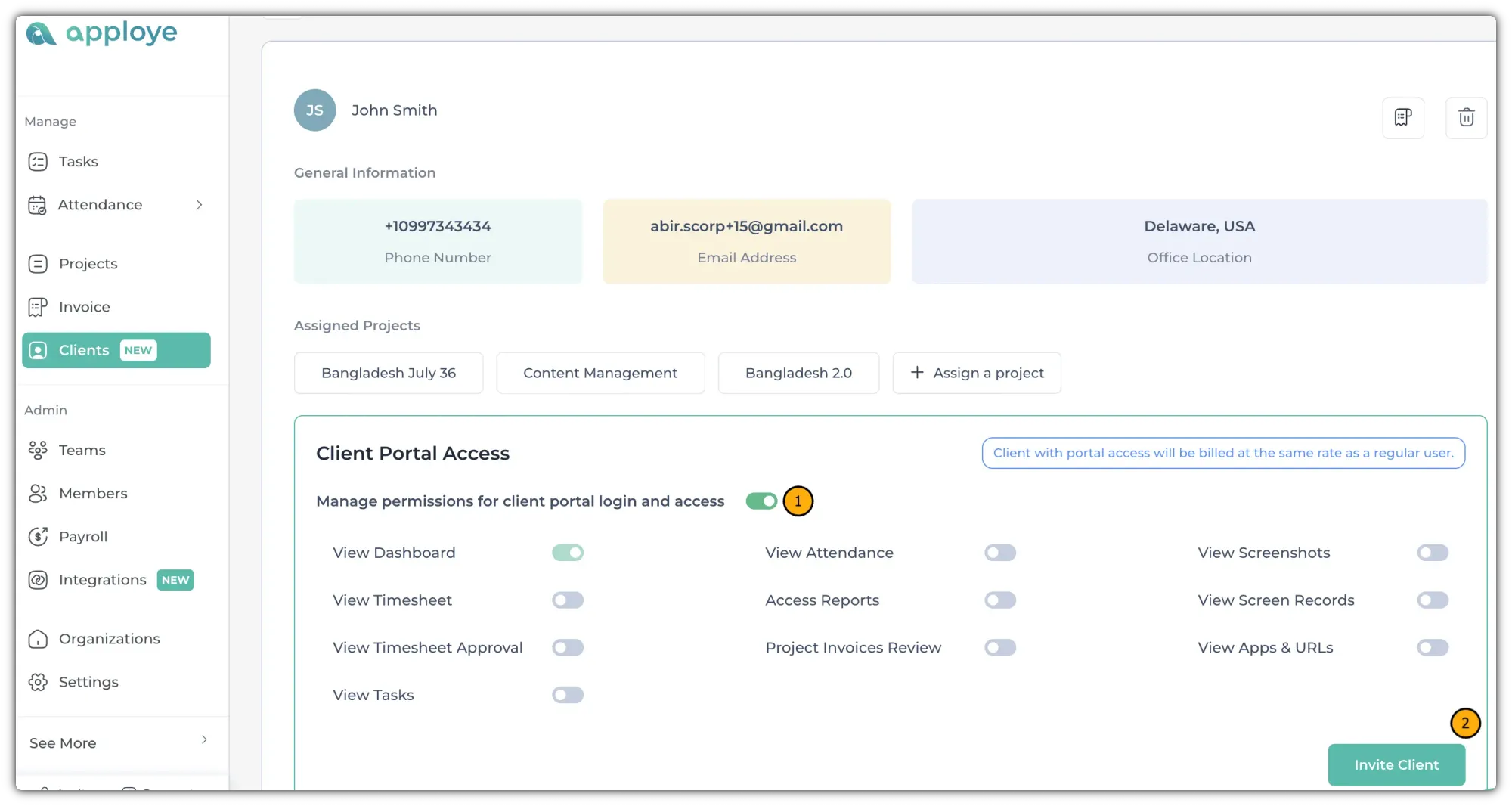 On the Clients page, you can add new clients by clicking the '+ Add Client' button. Once a client is added, you can grant them access to view data related to the employees assigned to them.