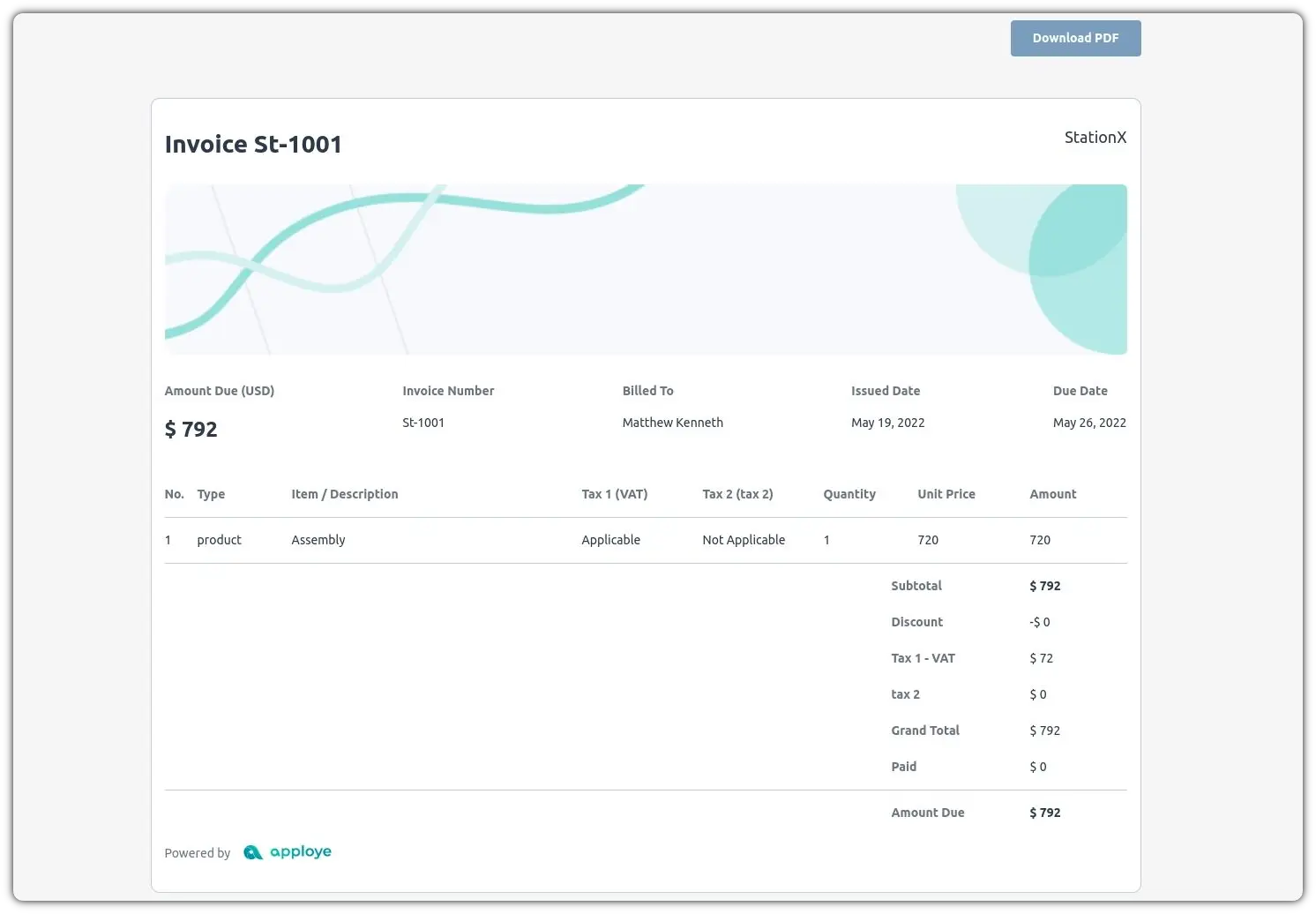 After s/he clicks on the View Invoice button/Link, they will be taken to the invoice preview. They will also be able to download it as a PDF.