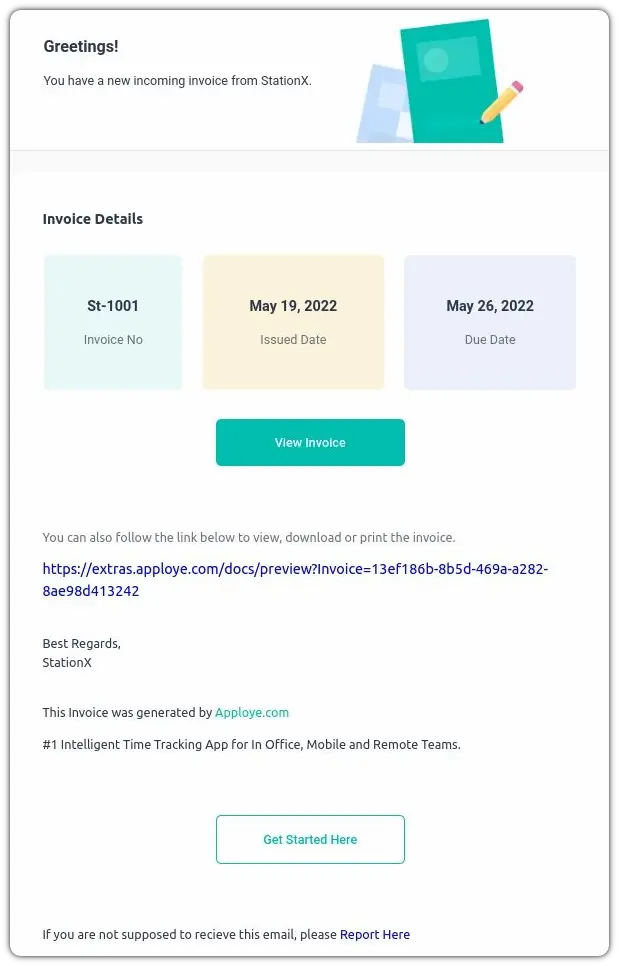 After you click on send, the client will receive an email from support@apploye.com: