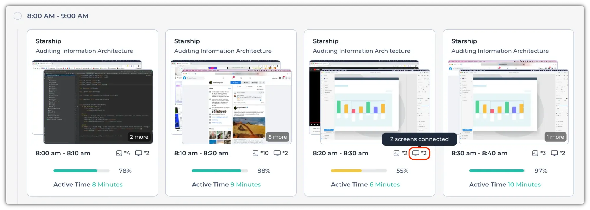Even though you might not see all of those screenshots in thumbnails of a 10-minute time frame, you can clearly see how many screenshots there are and how many screens/monitors are connected from the image and monitor icon, respectively.