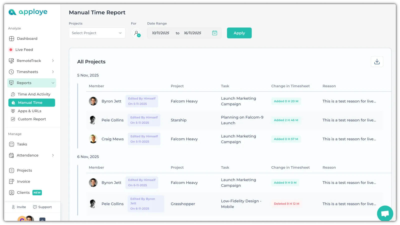 Active time is calculated from live tracking data with the desktop app. Manual entries are added without that activity data, so Apploye cannot treat them as "Active" time.