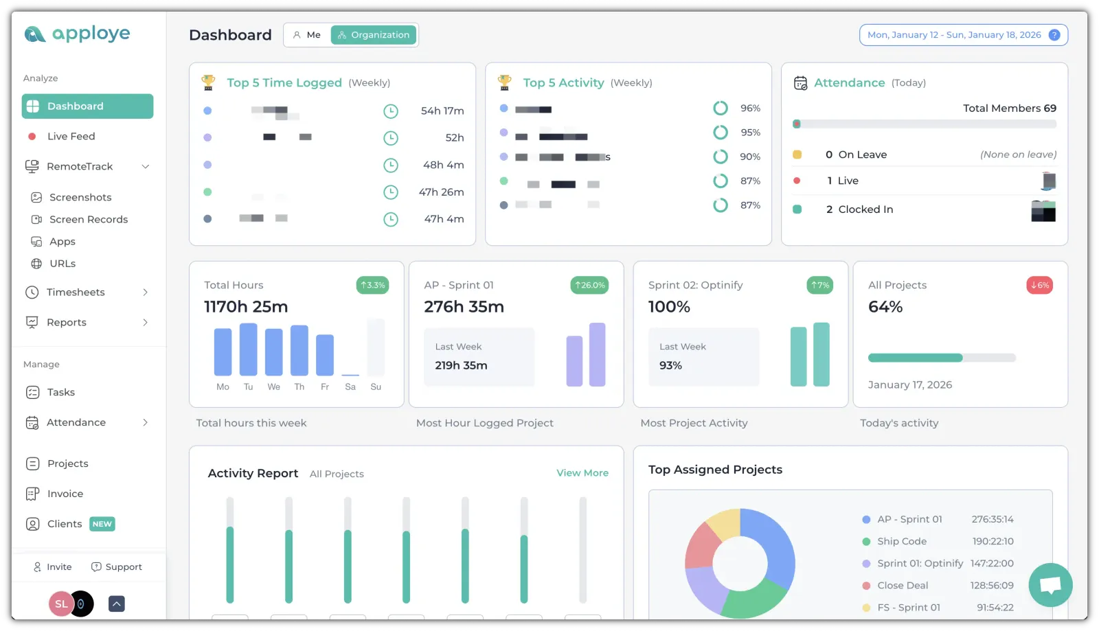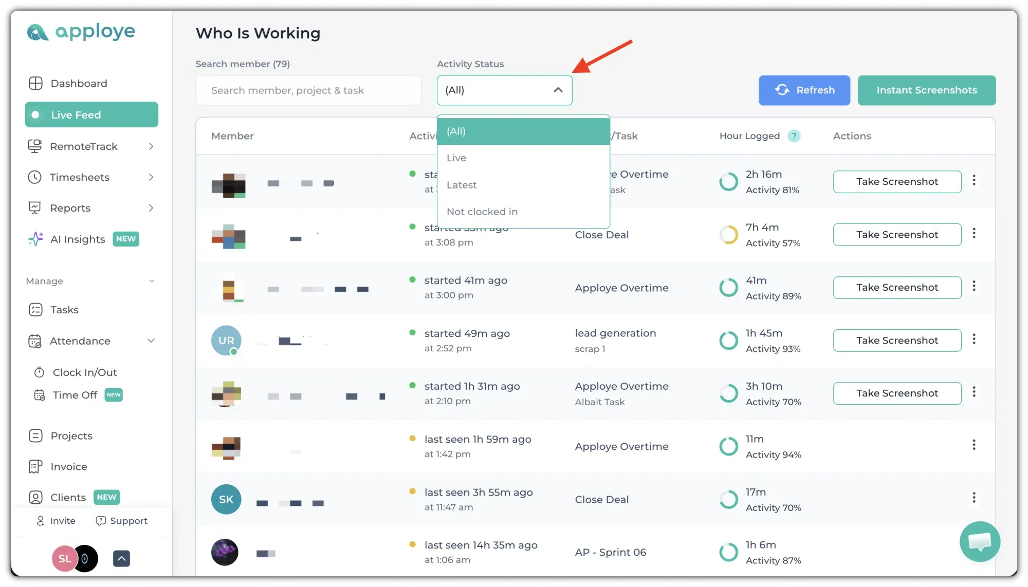 From Live Feed, admins can instantly see who is working, when the employee started tracking, and the employee's recent status (active, recently active, or not clocked in today).