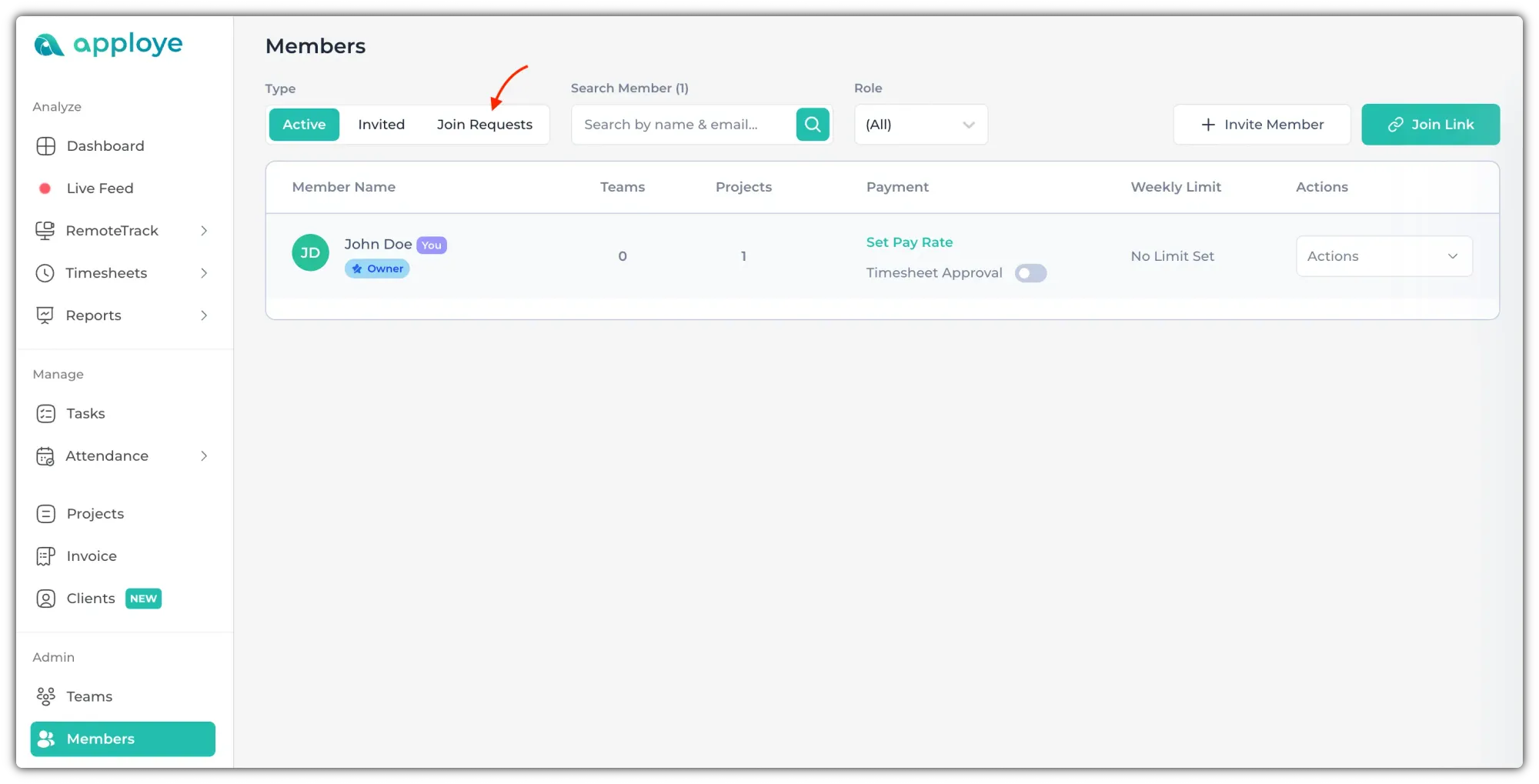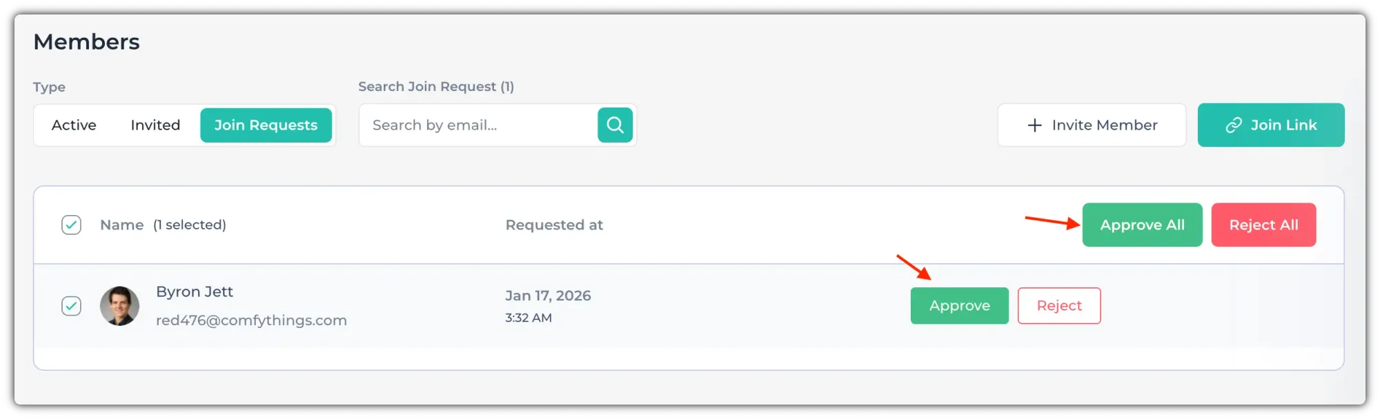 Now, click on "Approve" to approve any member. If you have multiple members, you can check the checkbox beside "Name" and select everyone. Click on "Approve All" to approve all of them.