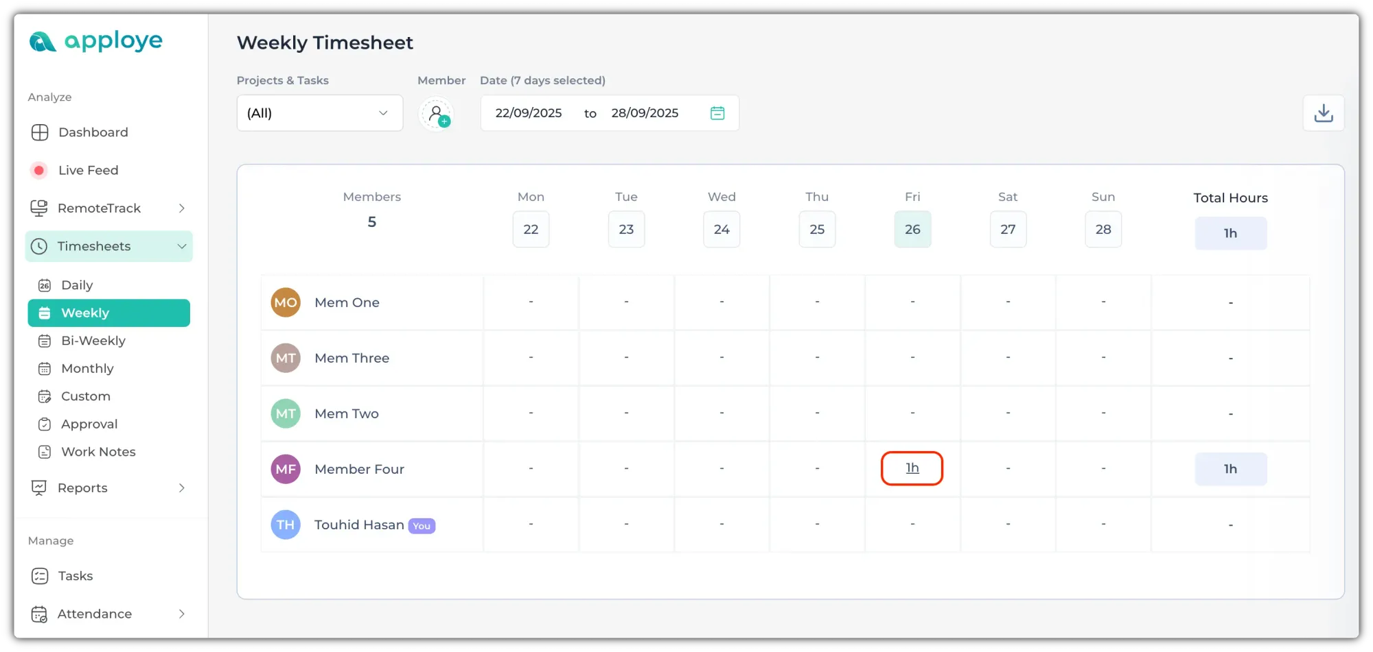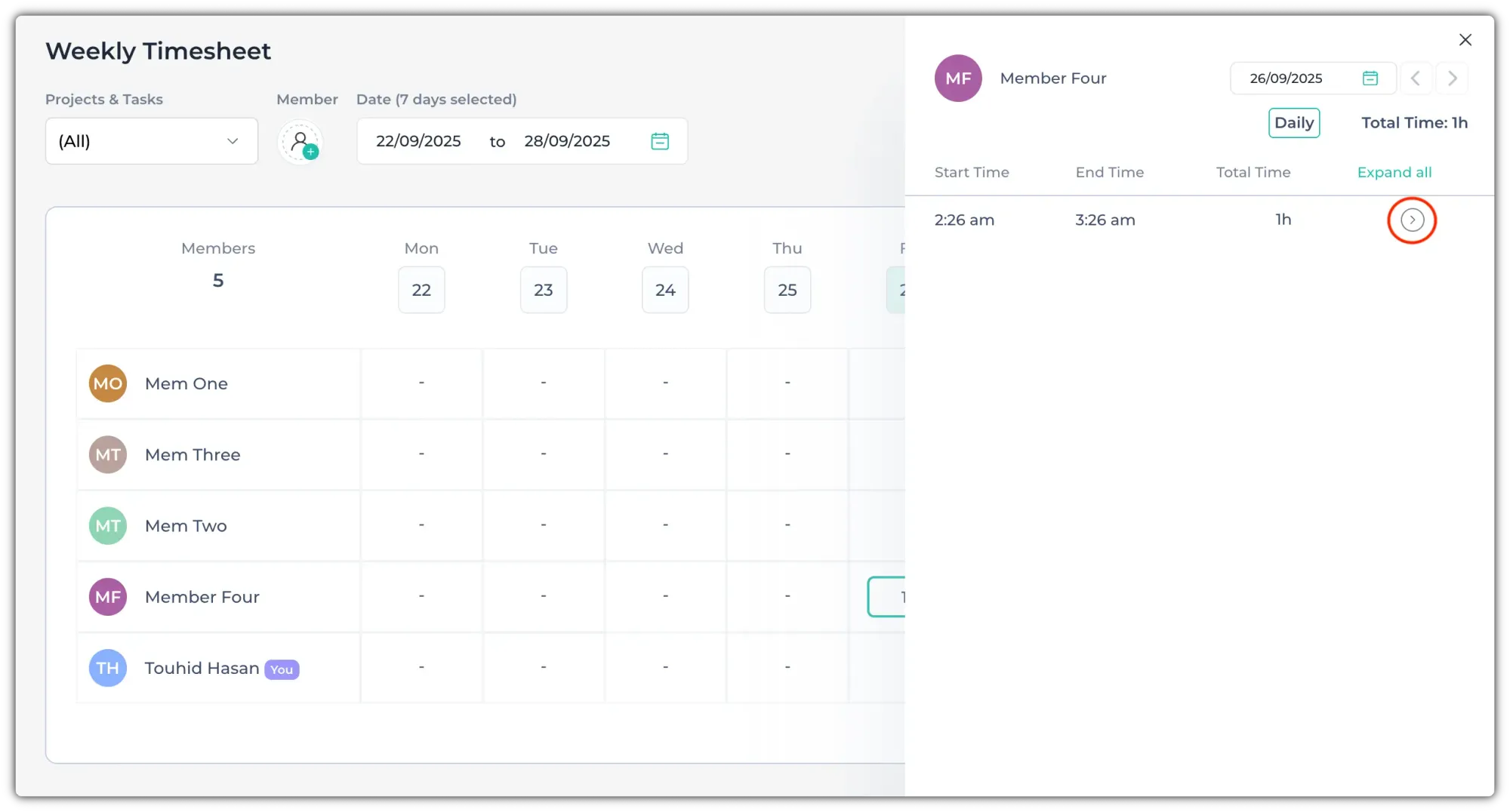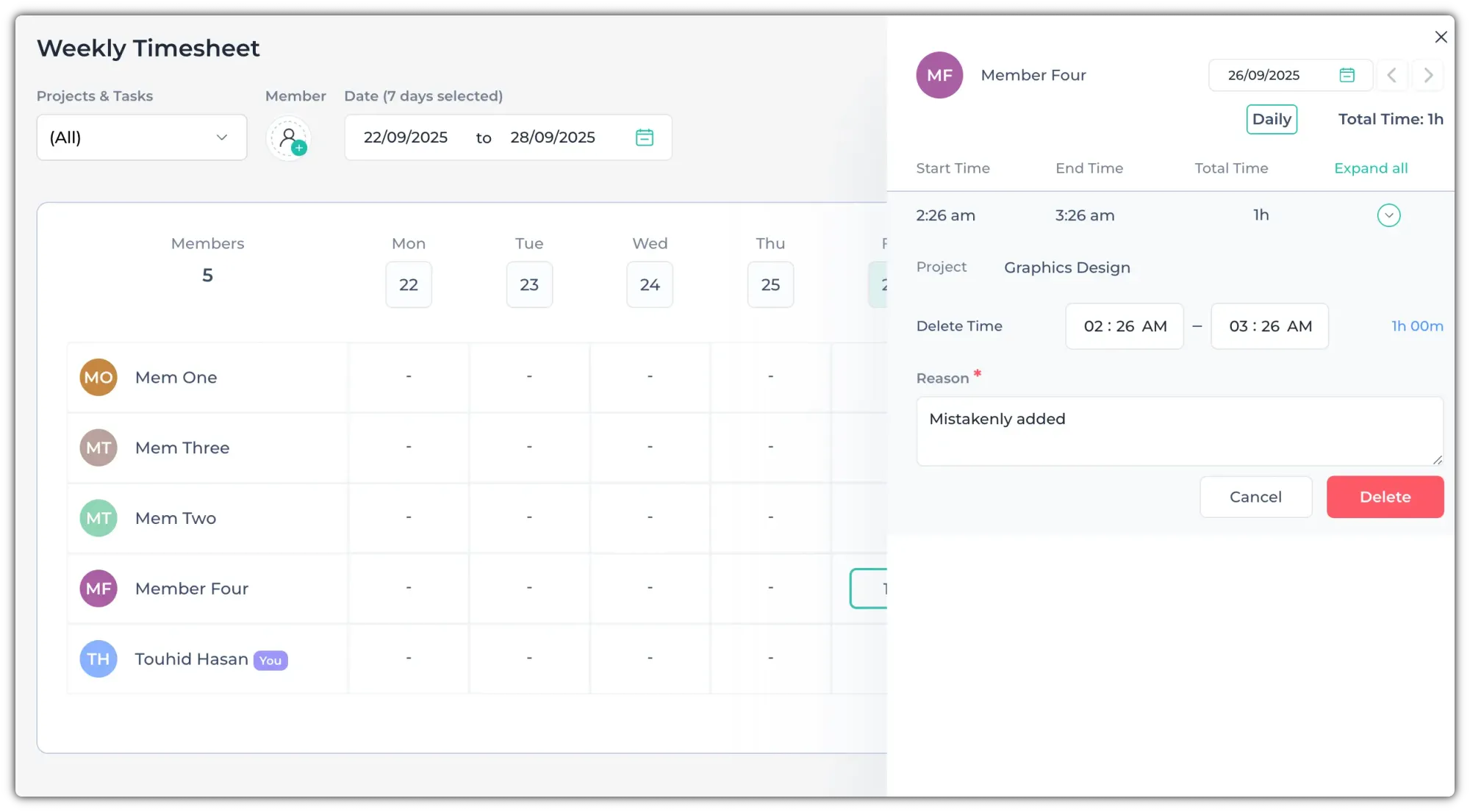 Go to Timesheet > Weekly and scroll to the member, whose timesheet you want to delete. Now, select the time on the desired date.