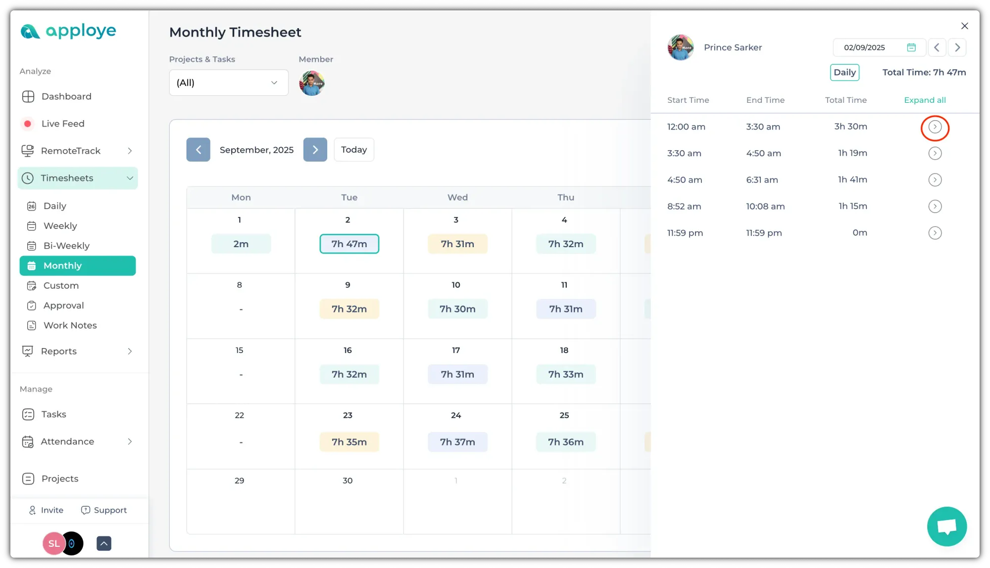 Now, click on the arrow (on the right) to open up the detailed view. Similar to weekly timesheet deletion, give a reason and click on "Delete" to delete that time.