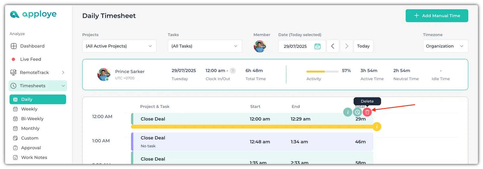 To delete a timesheet, Go to Timesheets > Daily, and select the employee and date. Then hover over the timesheet you want to delete.