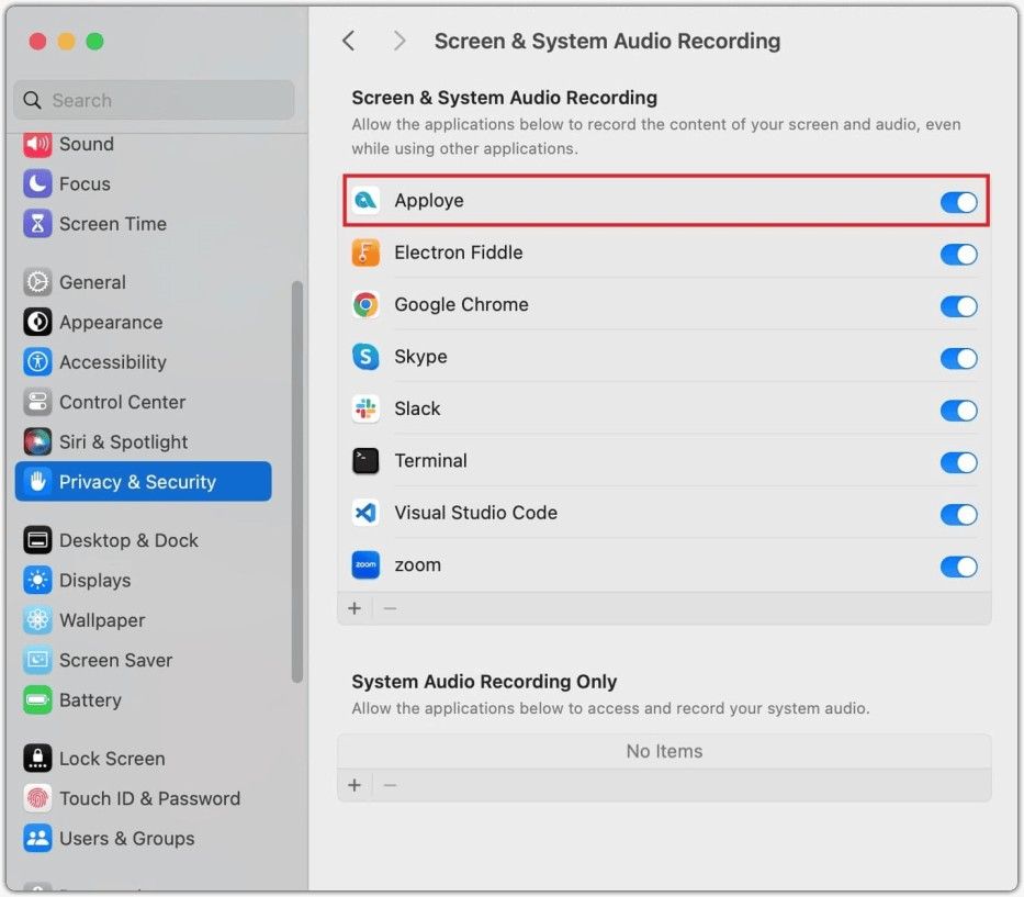 For Screenshots: Go to Settings > Privacy & Security > Screen & System Audio Recording, and turn the toggle button ON for Apploye.
