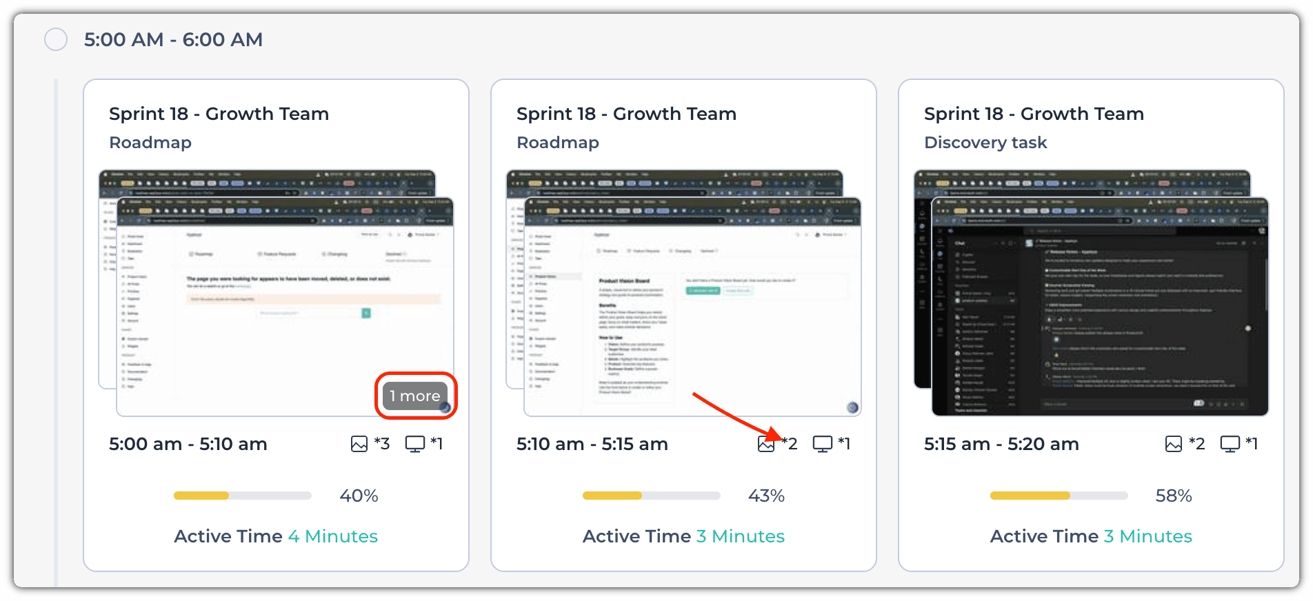 If there are more screenshots being taken in a 10-minute period, you can see a stack of screenshots being generated. If there are more than 2, you can see the extra screenshots being marked as "1 more" (in case of 3 screenshots per 10 minutes) and 8 more (in case of 10 screenshot per 10 minutes) and so on.