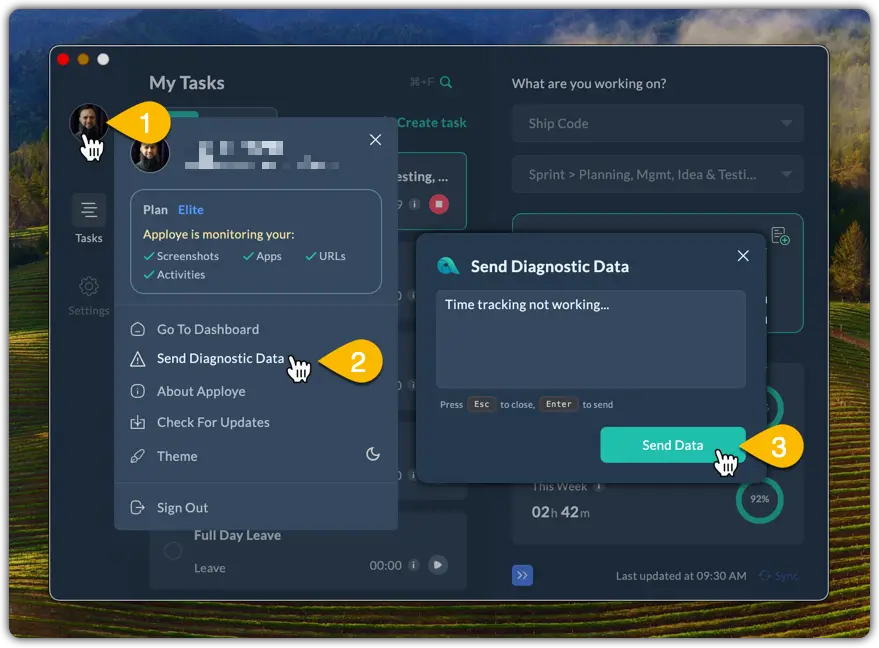 Third, write the detailed issue you are facing in the box with the Apploye desktop app, and click on Send Data.
