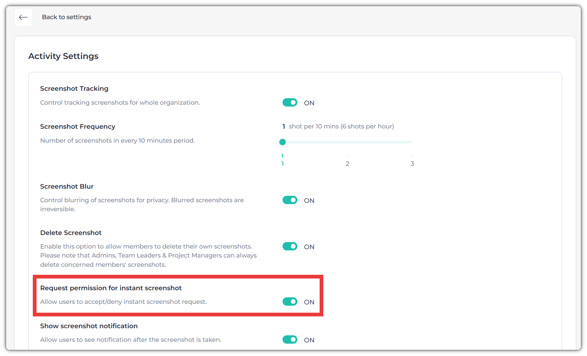 After clicking on 'Take Screenshot', your employee will need to permit the capture of their screen. That's why the status Pending will be shown. You can turn the settings off from activity settings.