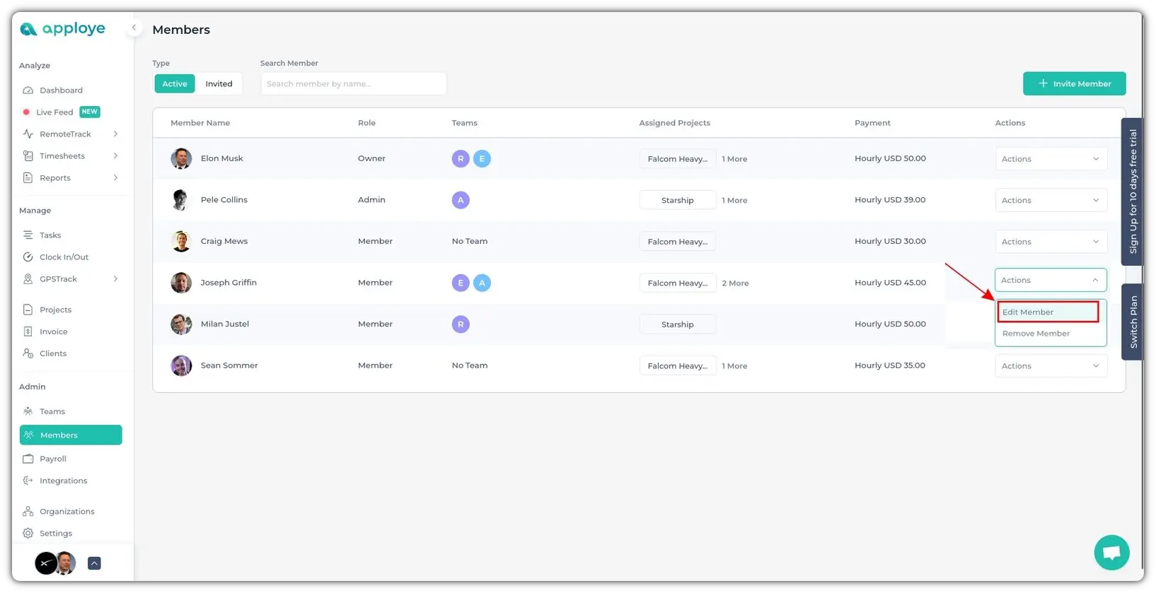 Then click on the Actions dropdown button. Then click on Edit Member.