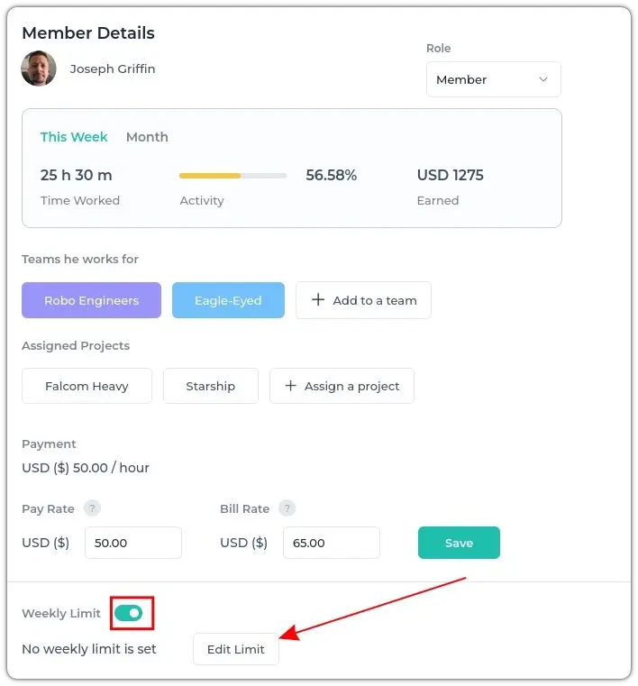 š After that, you'll be taken to Member details. Now, scroll to the bottom of the page and turn on the Weekly Limit radio button. And click on the Edit Limit button.