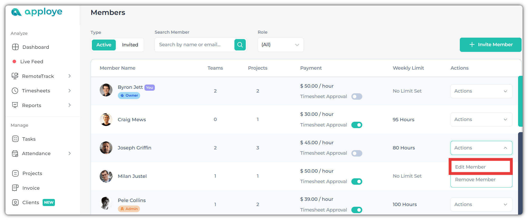 Click on Actions from the drop-down menu on the right, then select Edit Member.