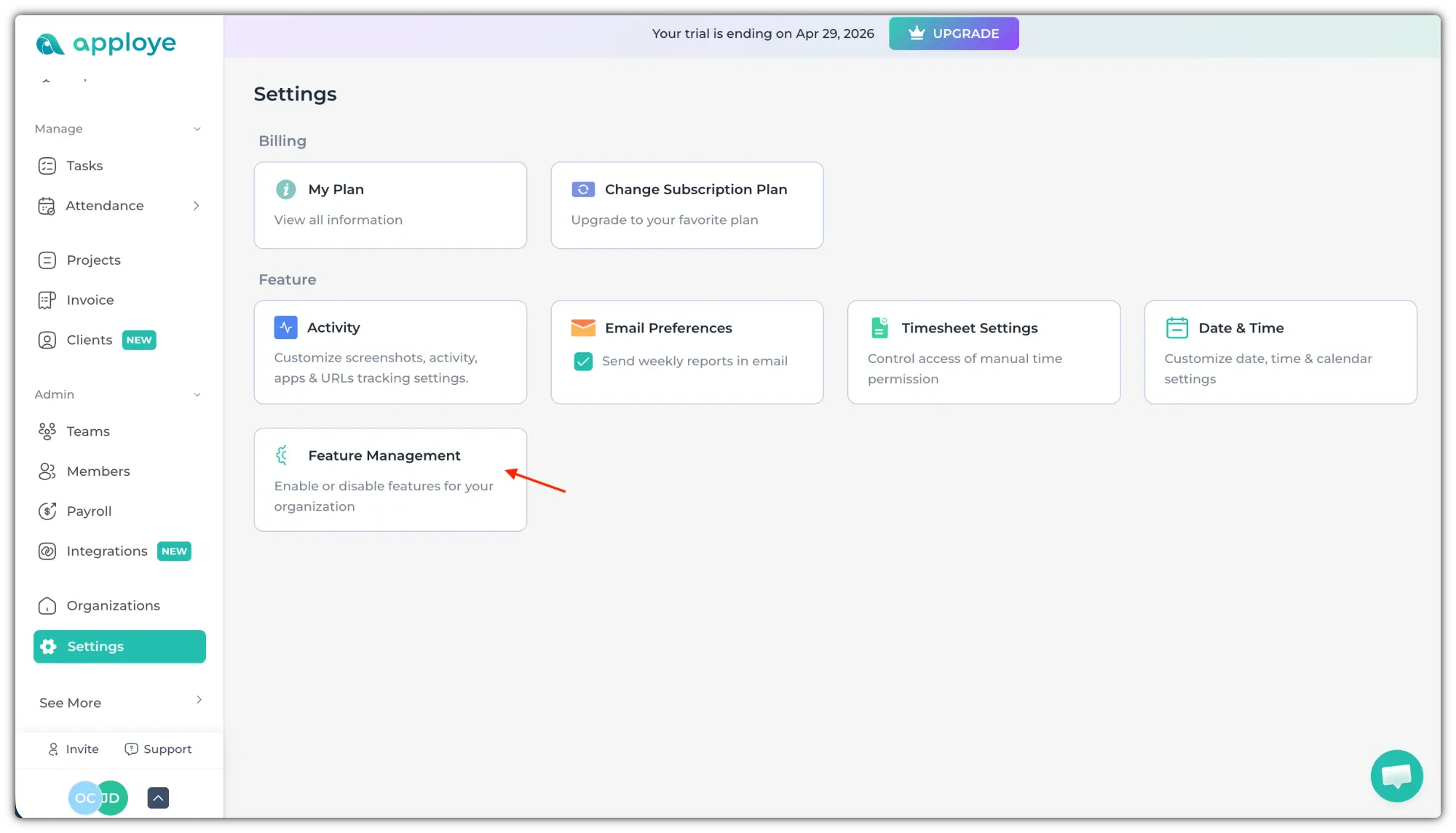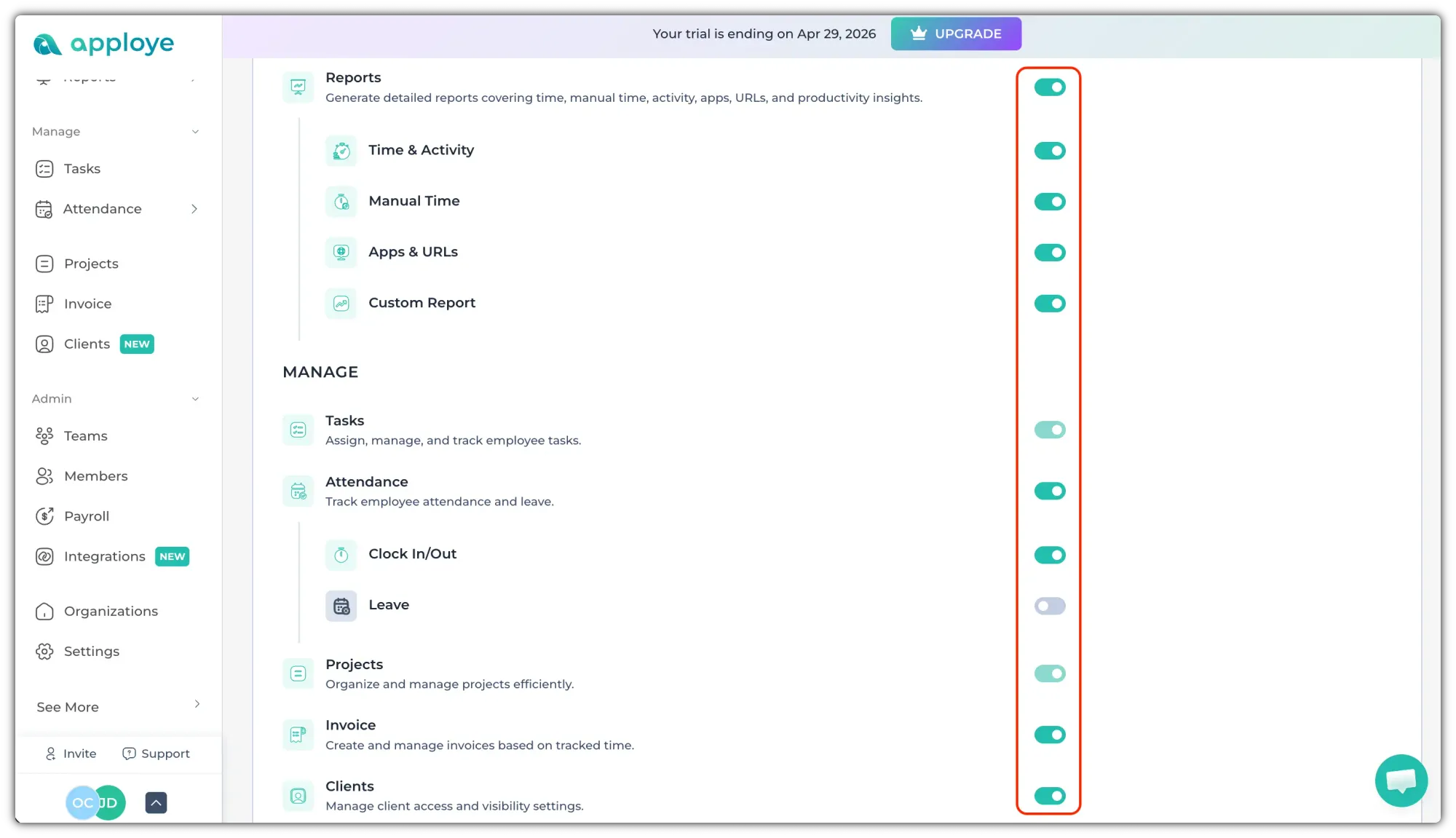 Apploye allows you to turn on/off specific features from the web app to keep the sidebar short and clean. You can hide the menus/features that you don't need. Please note that hiding any menu will hide it for all the users of your organization.