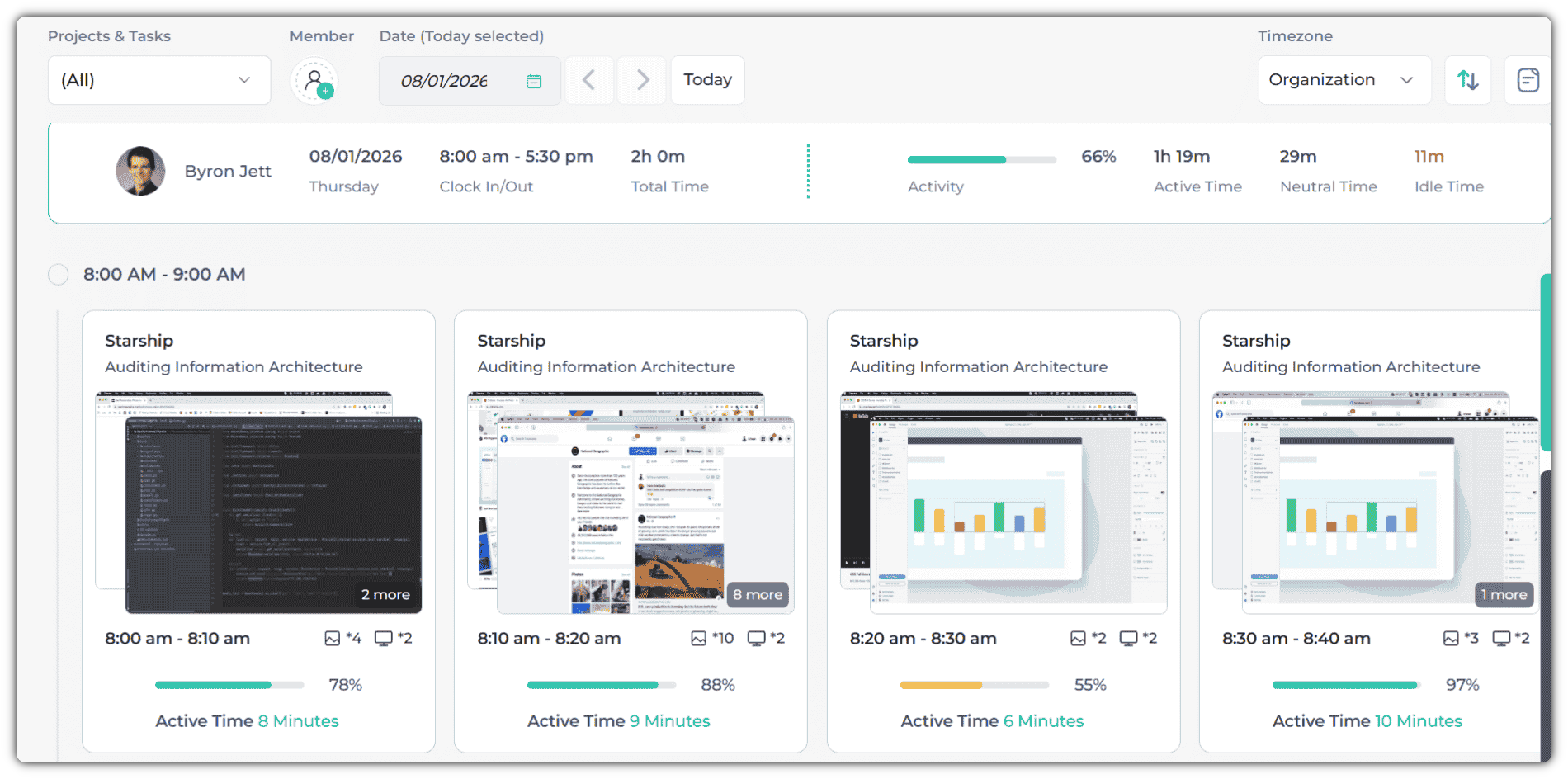 Monitor productivity using the Activity Percentage, which provides a breakdown of Active, Neutral, and Idle time, along with the total hours worked.