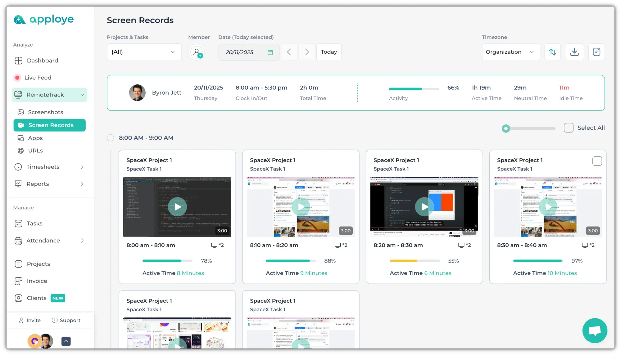 Screen records in Apploye help you see what your team is working on during their tracked time. The screen recording feature captures short video clips of your team’s activity, giving you better visibility into their daily work.