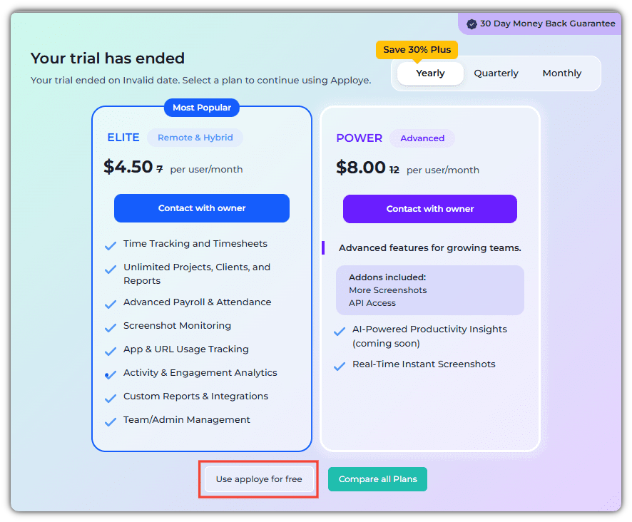 After choosing the option, use Apploye for free. Your account will be activated under the Apploye Starter Plan.