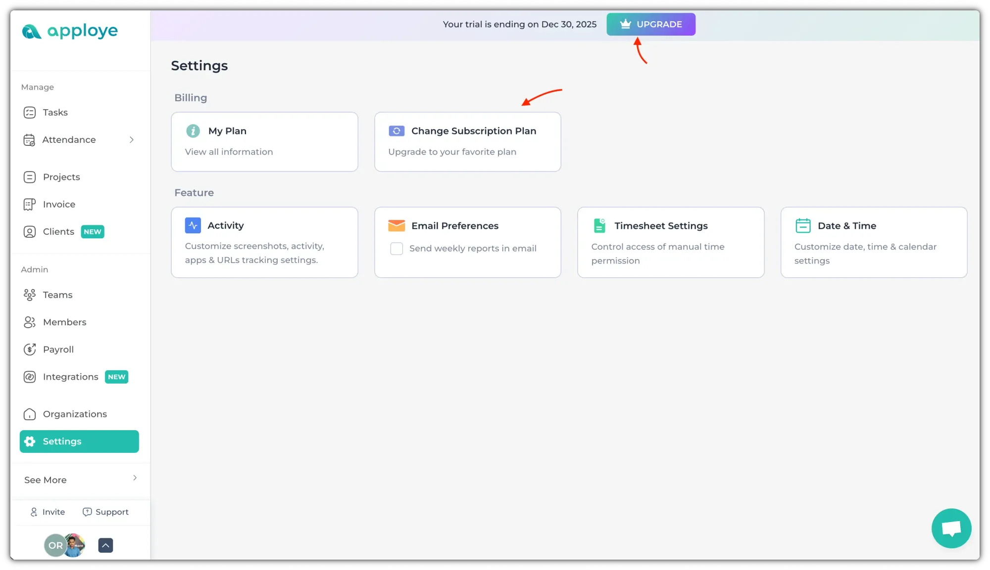 During the trial, you will see the "Upgrade" button on the web app. Click on it or go to Settings > Change Subscription Plan to upgrade the plan.