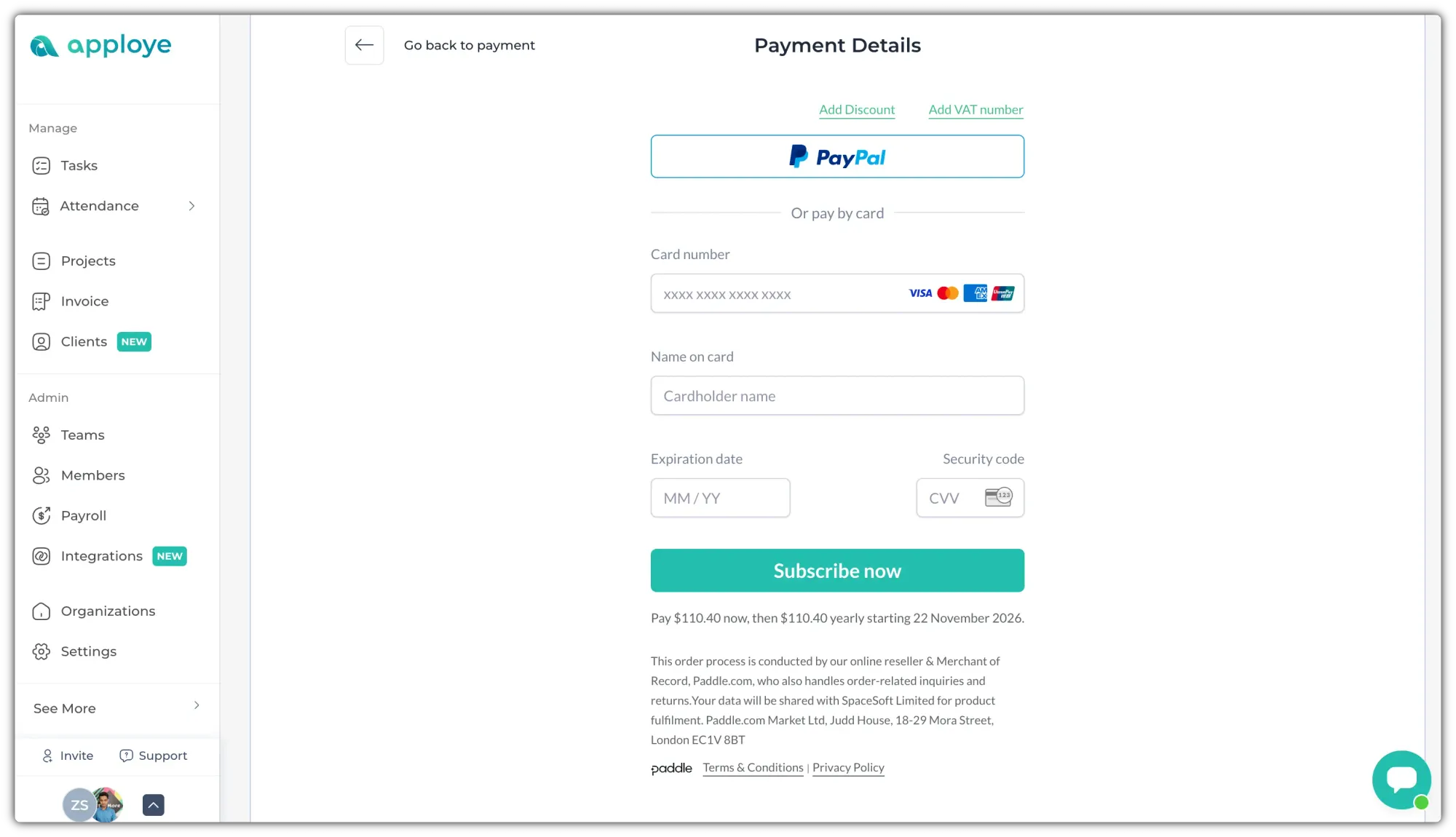 If you require assistance with payment, please contact Apploye Support via live chat or email at support@apploye.com.