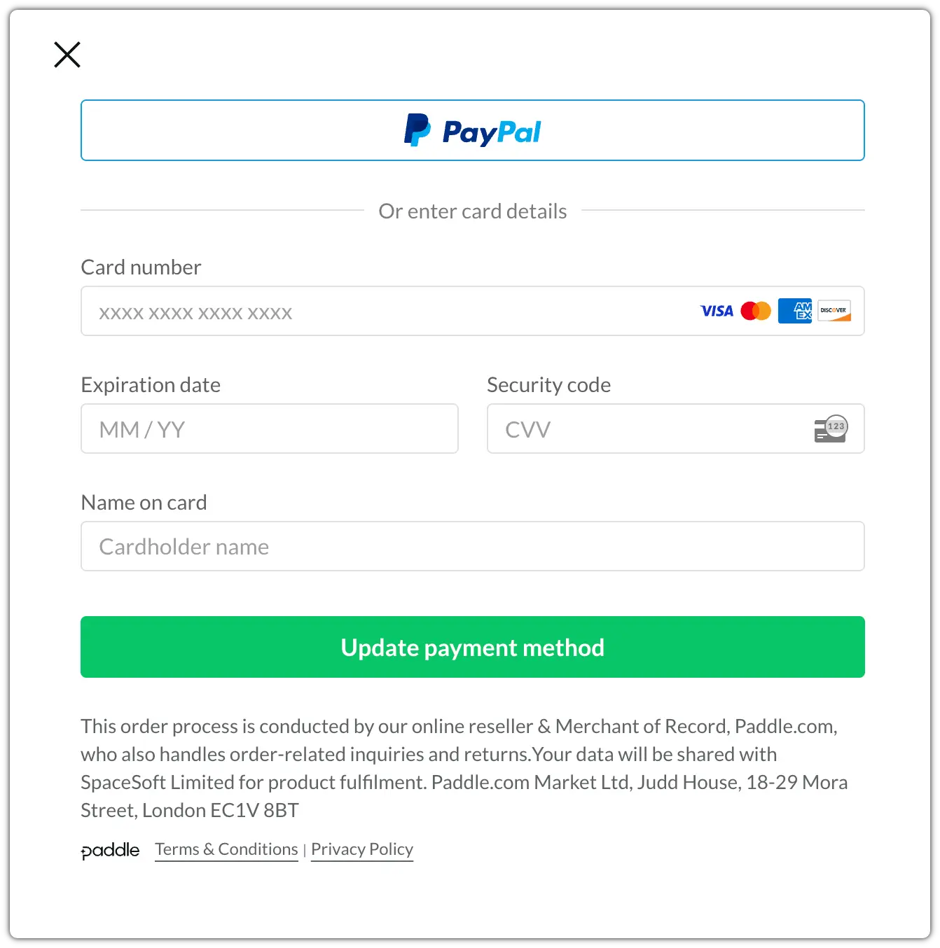 Go to Settings <> Change card to update your existing card details. You will be directed to the Paddle customer portal, our payment gateway. You can update the card information in that portal.