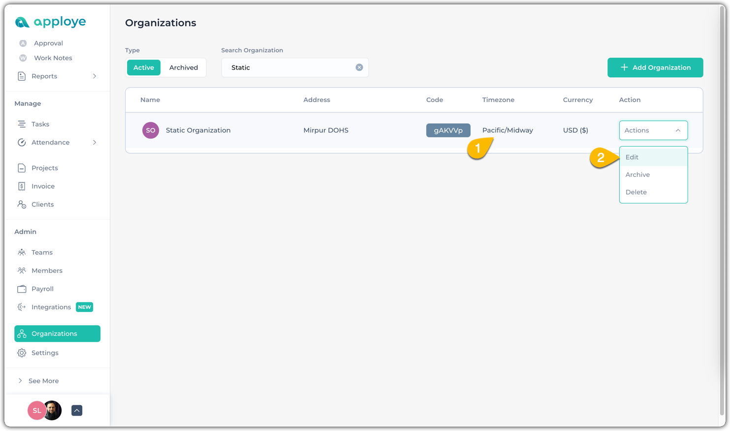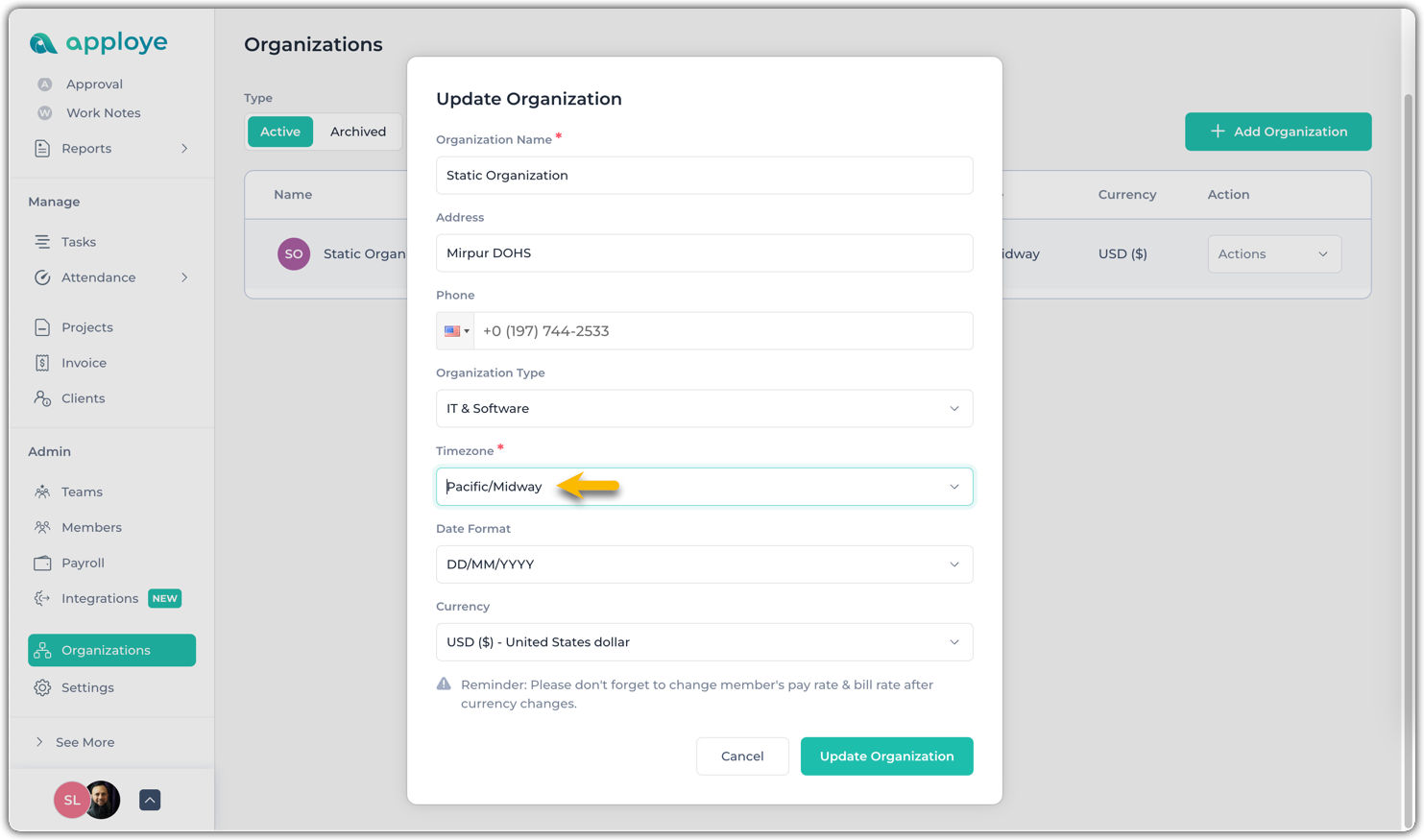A pop-up will open. Now, click on the "Timezone" dropdown and select your organization's new timezone.