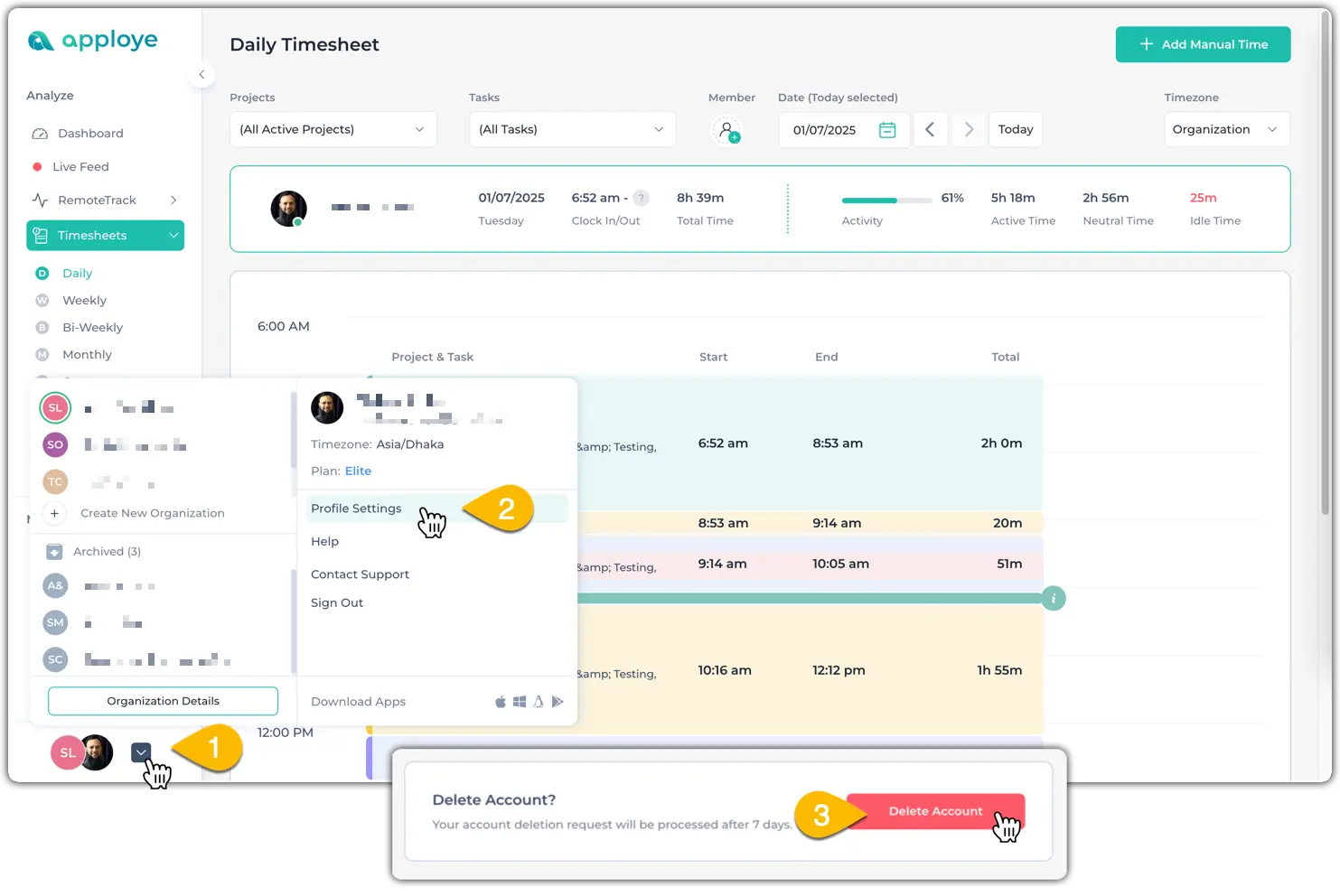 To delete the account, please go to Profile Settings and you'll land to profile edit page. Then scroll down to the 'Delete Account?' section. Click 'Delete Account' to activate delete request.