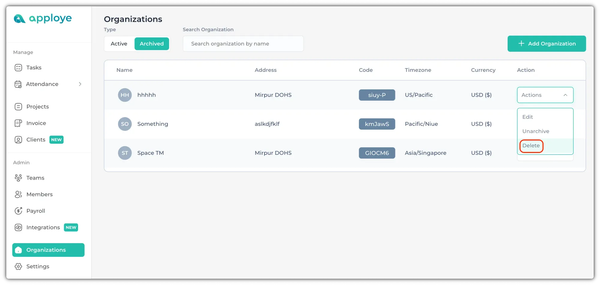 To delete an archived organization, go to the Organizations page from the left side panel.