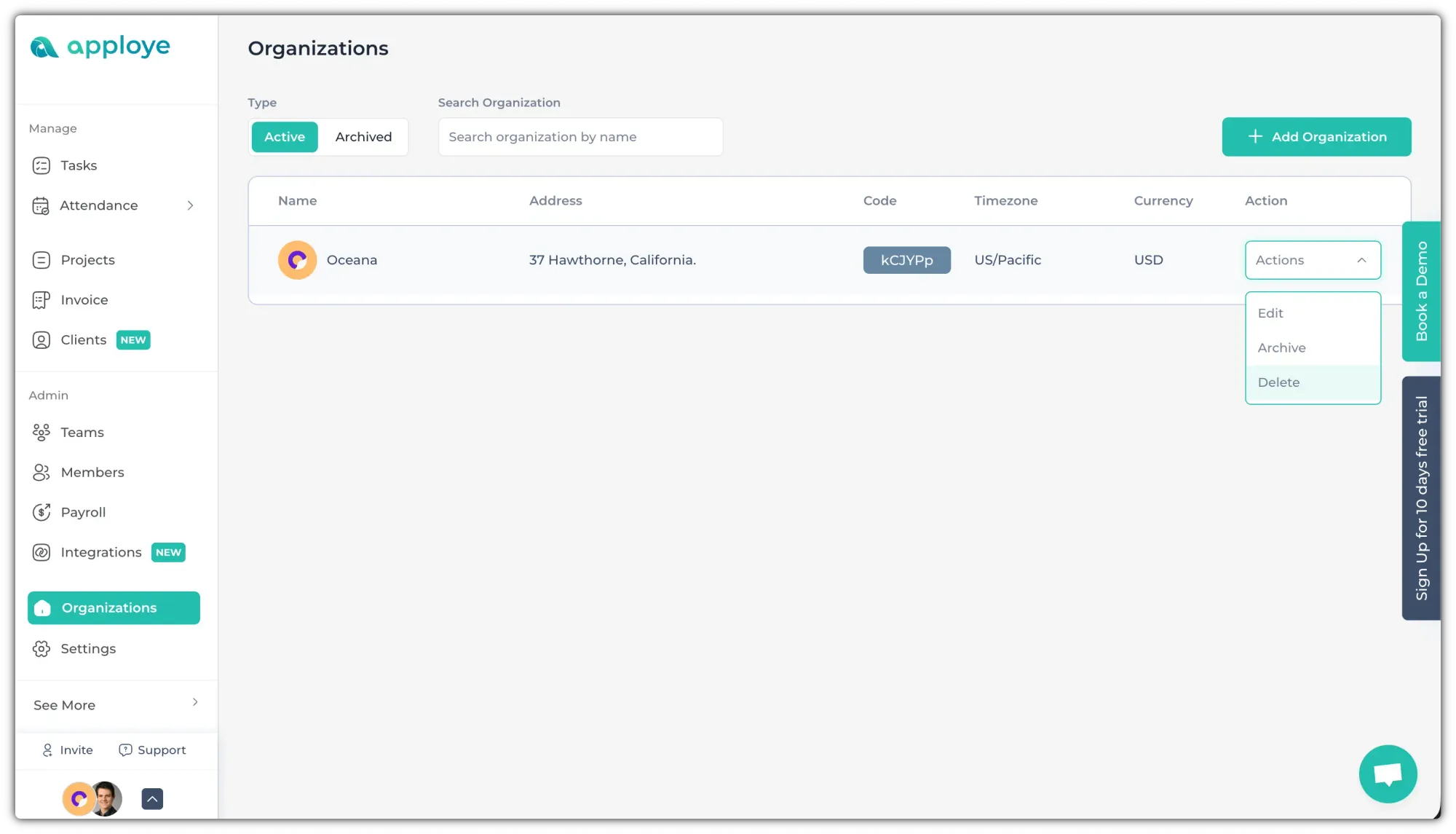 Deleting an organization in Apploye permanently removes its data. Follow the steps below only if you are sure you no longer need this organization and its data.